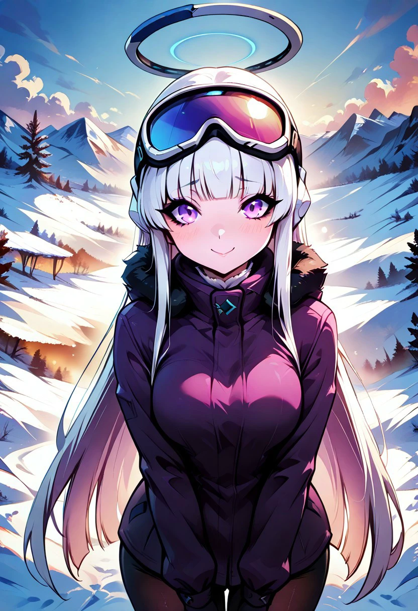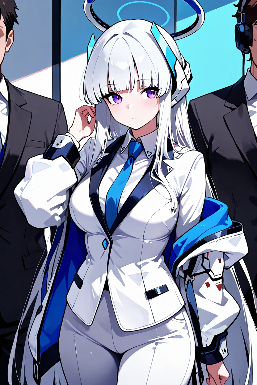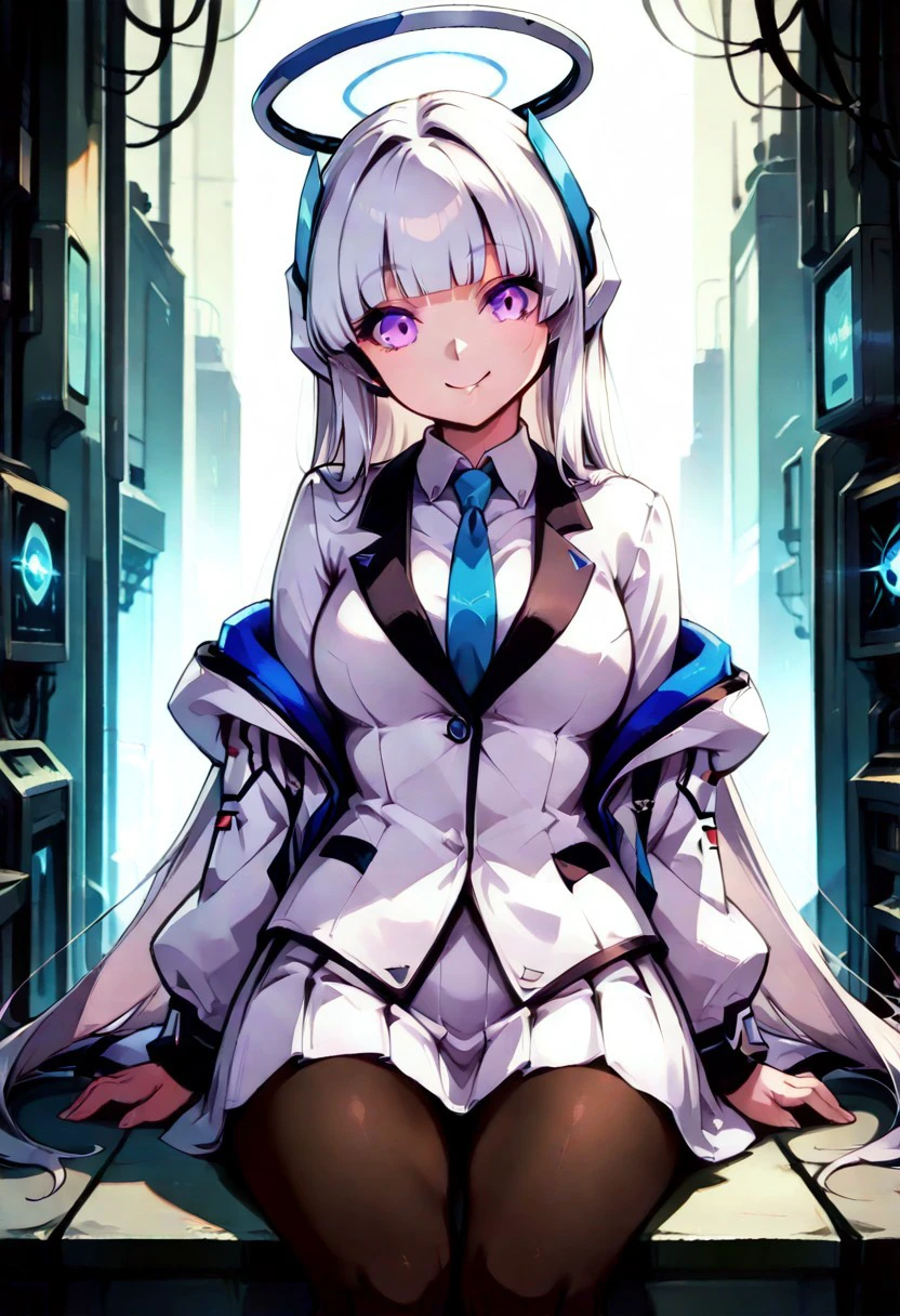 zzNoa, long hair, halo, mechanical halo, purple eyes, white hair, very long hair, blunt bangs, black pantyhose, blue necktie, collared shirt, long sleeves, white jacket, white shirt, white skirt, pleated skirt, open clothes, suit,