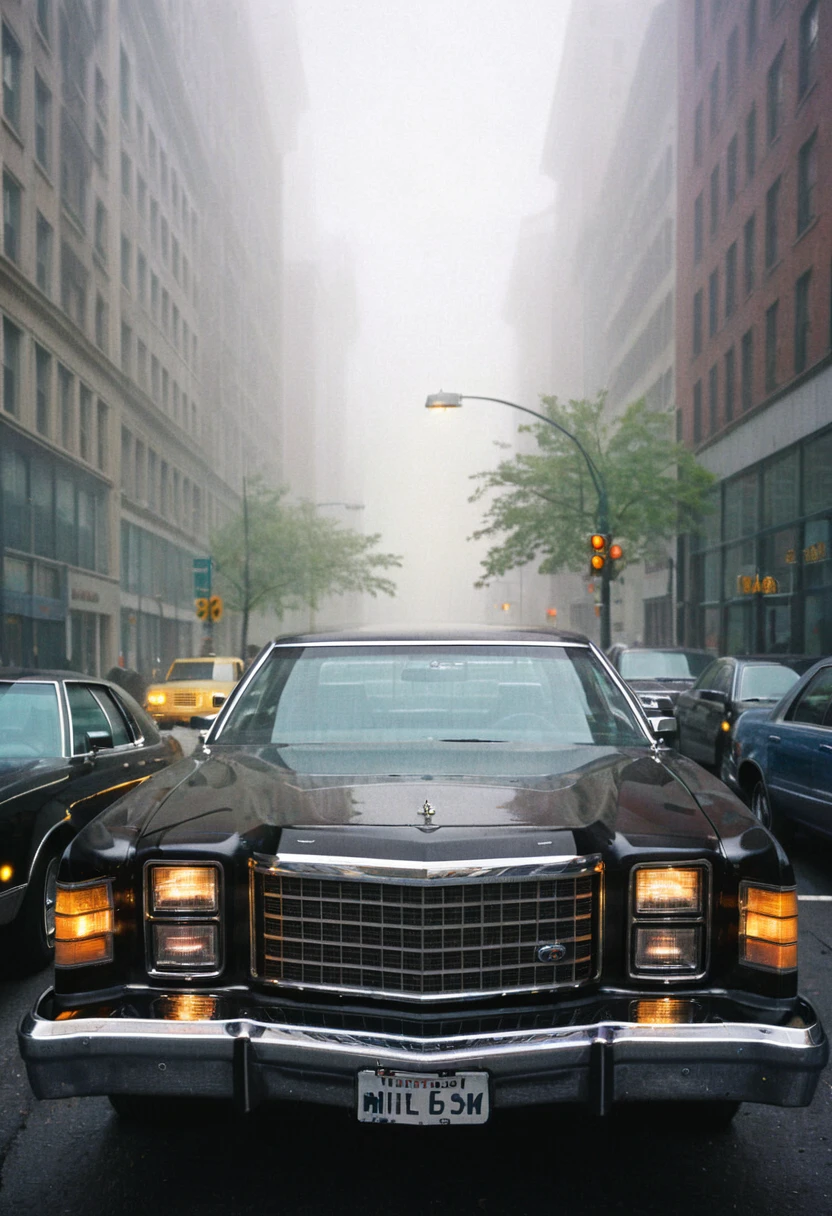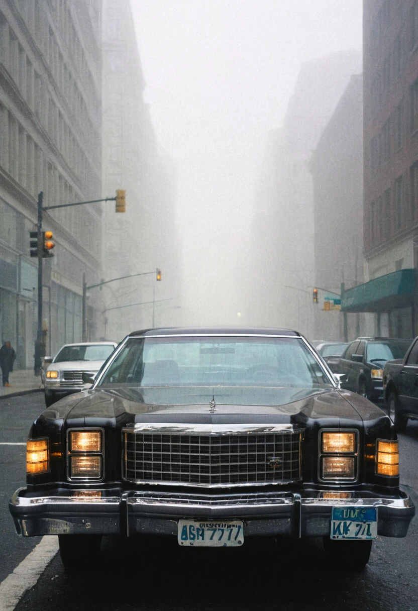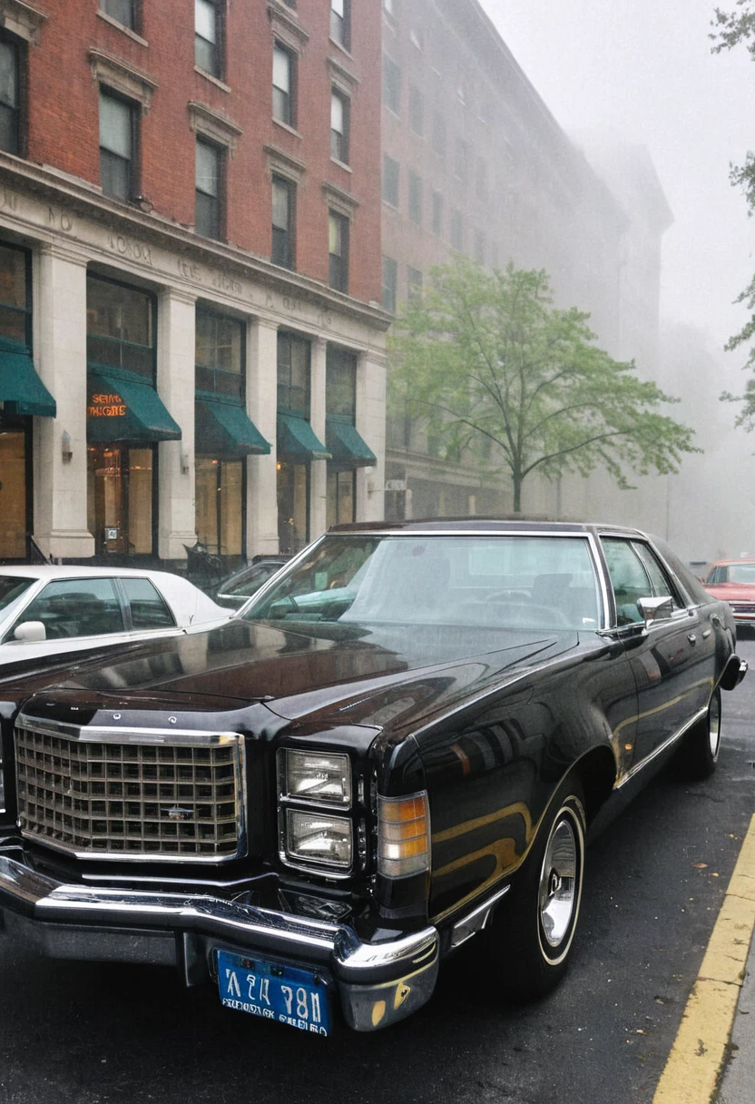 ClassicSportsCar, black Ford LTD, front view, New York avenue, foggy morning