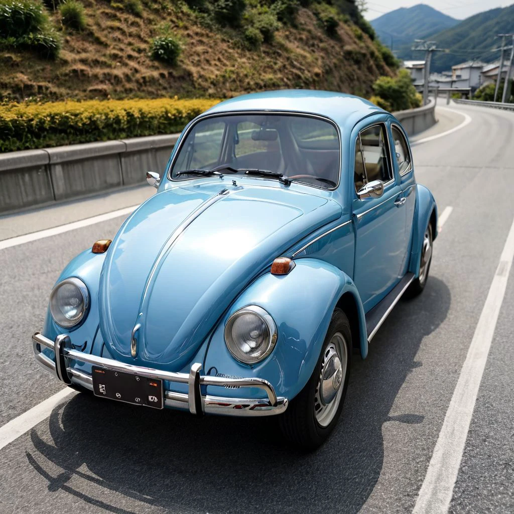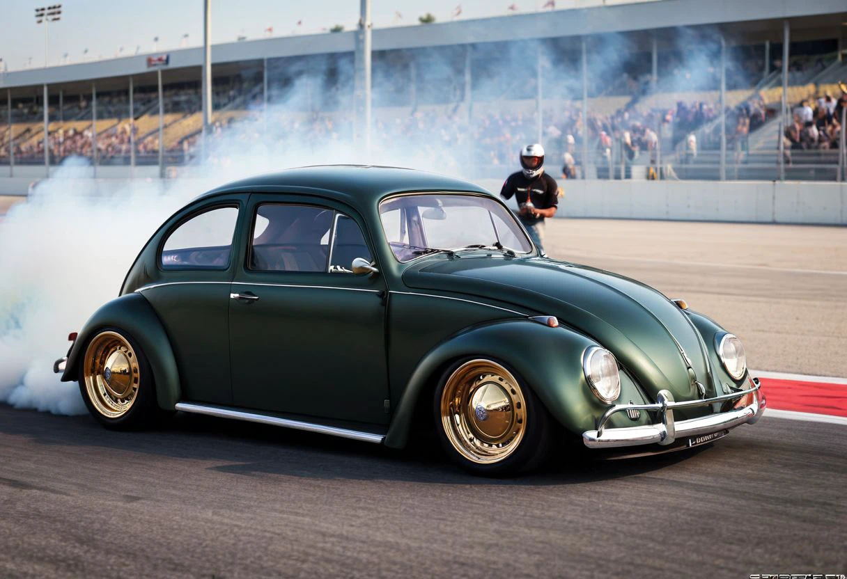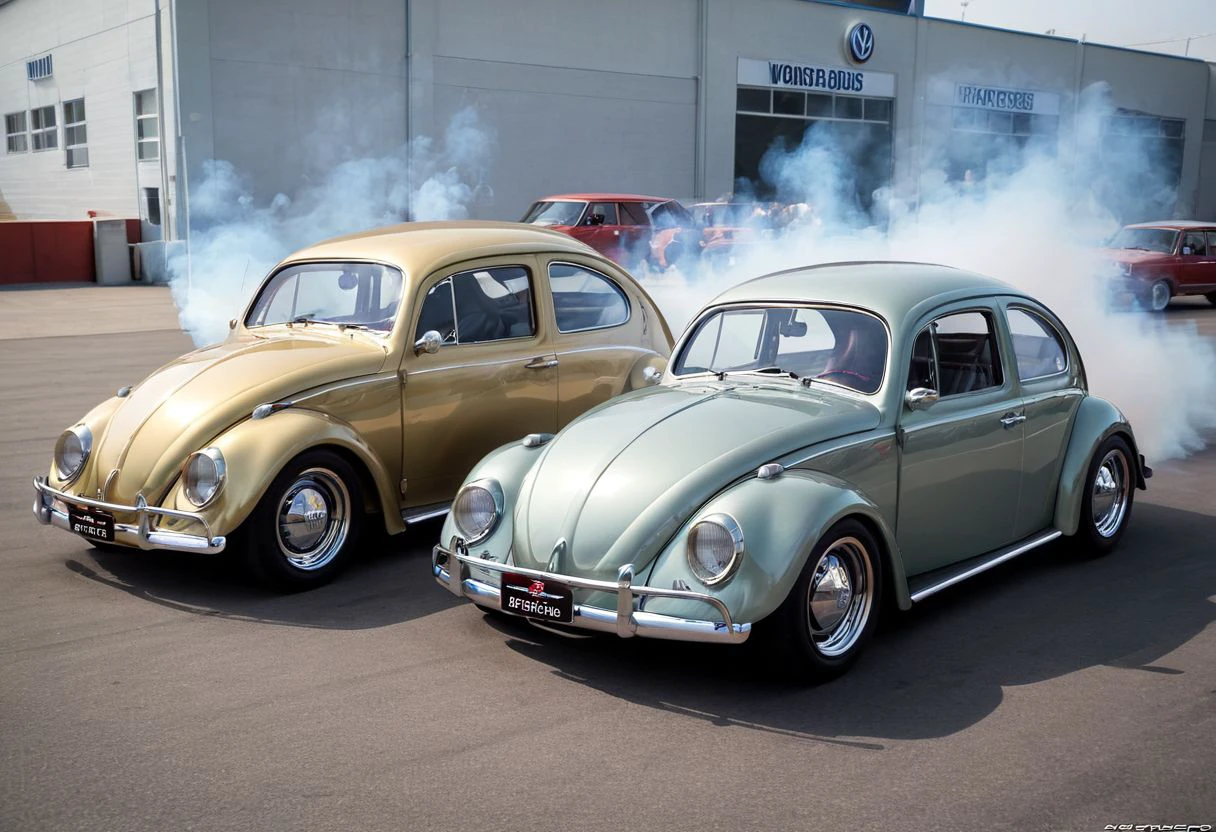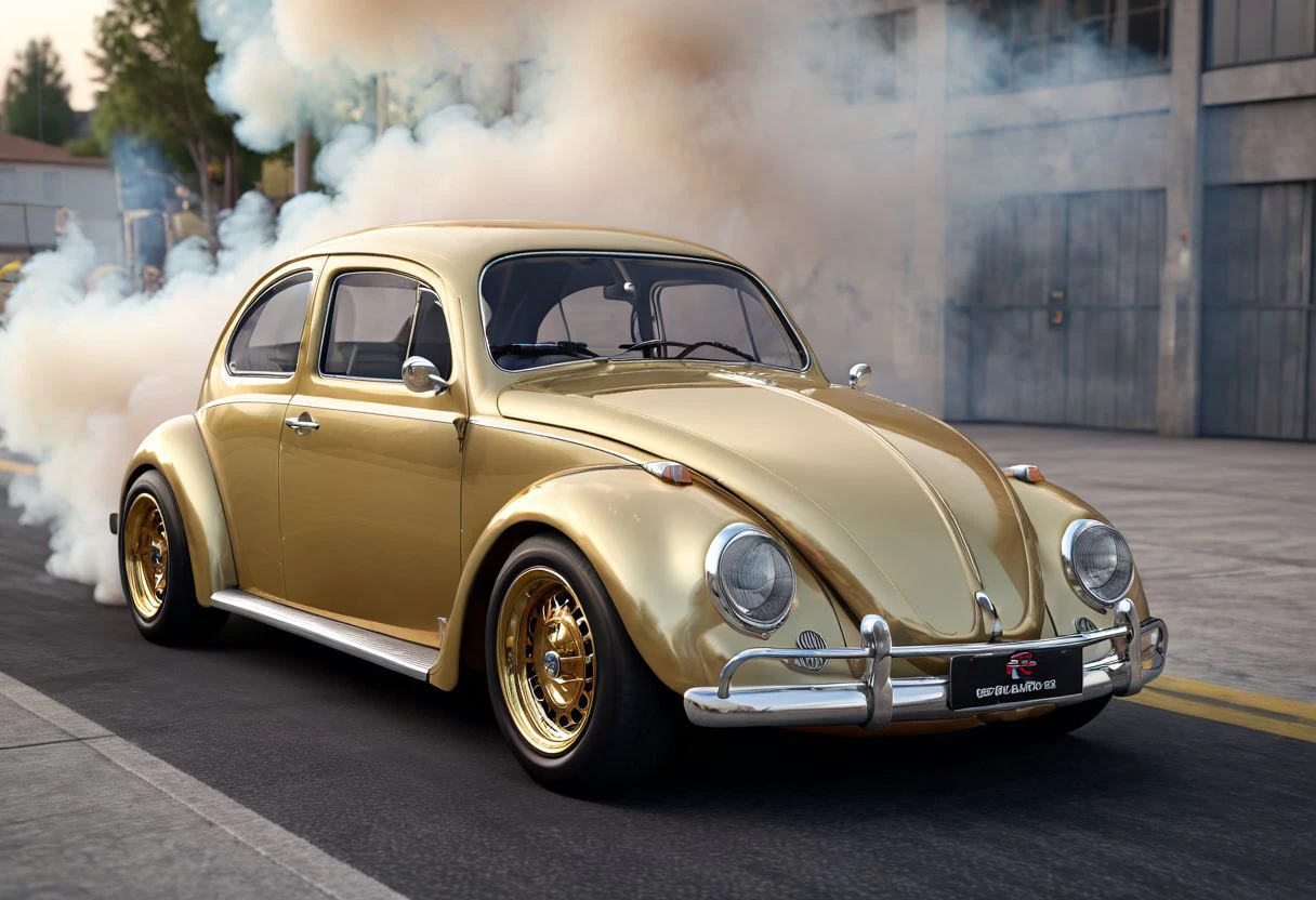 Prompt: 'fusc4 photo', Volkswagen beetle in the Osaka city, Candy Metalflake color, Whitewall tires, Racing slicks, Wide tires, Chrome rims