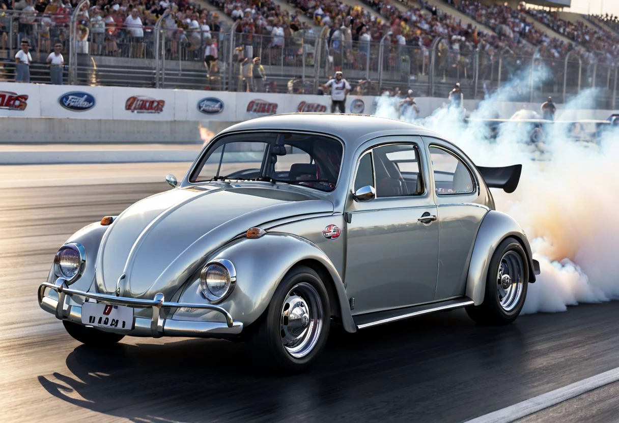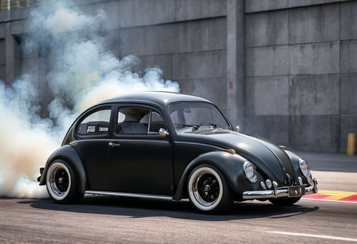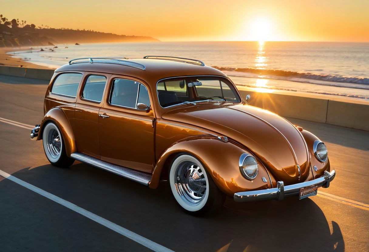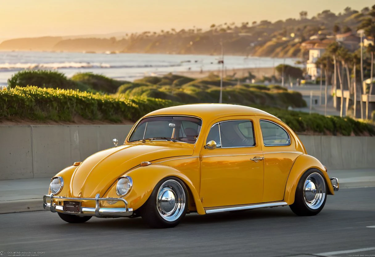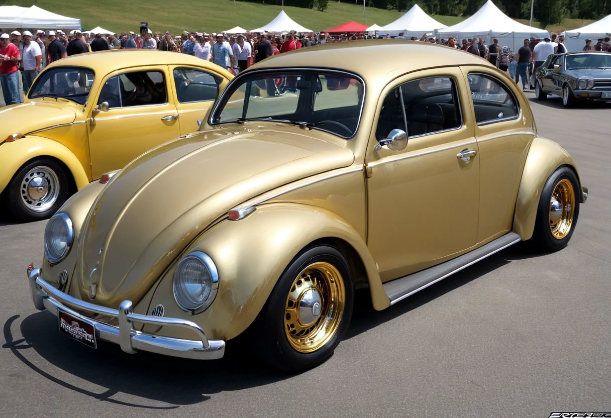 Prompt: 'fusc4 photo', Volkswagen beetle in the Osaka city, Candy Metalflake color, Whitewall tires, Racing slicks, Wide tires, Chrome rims