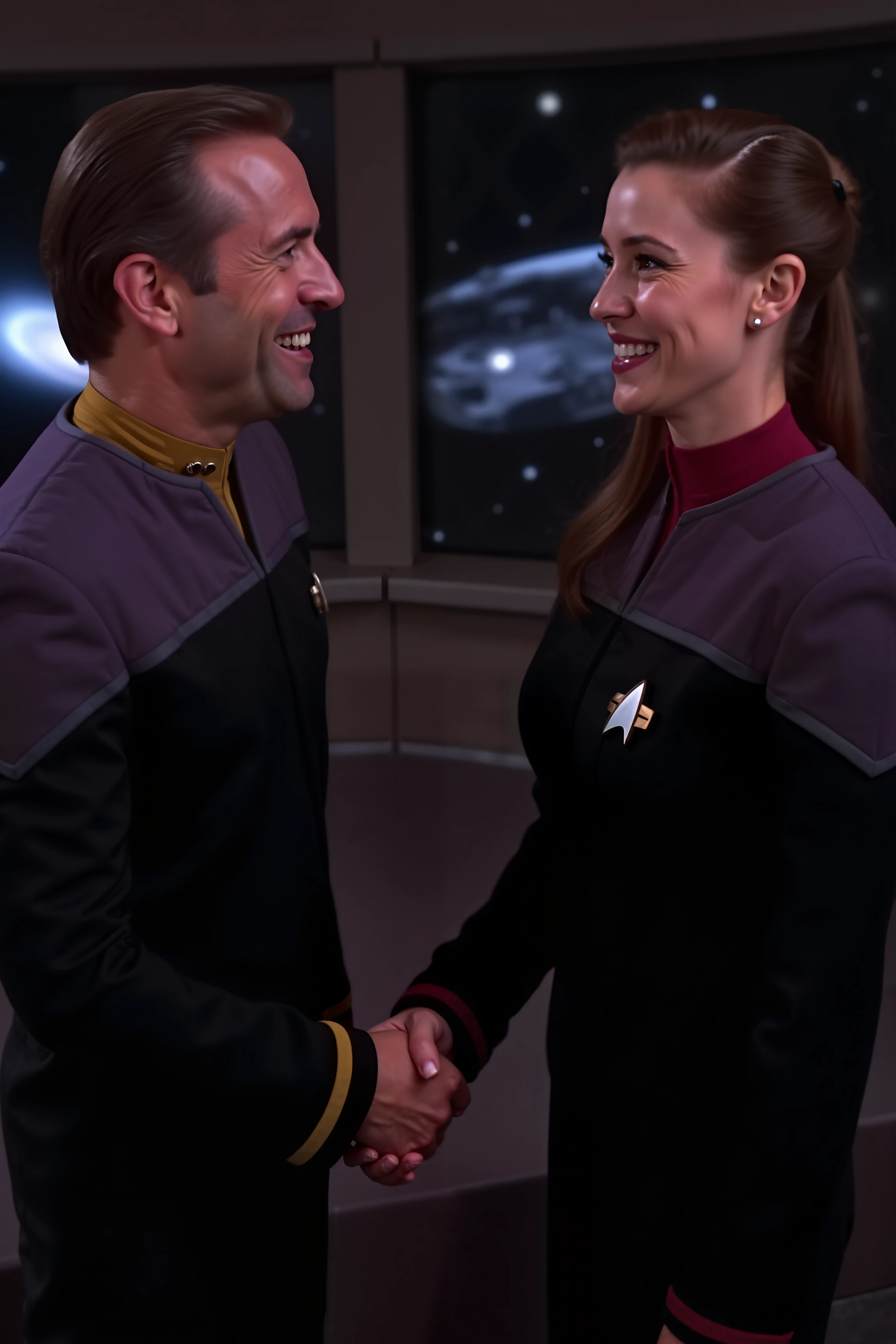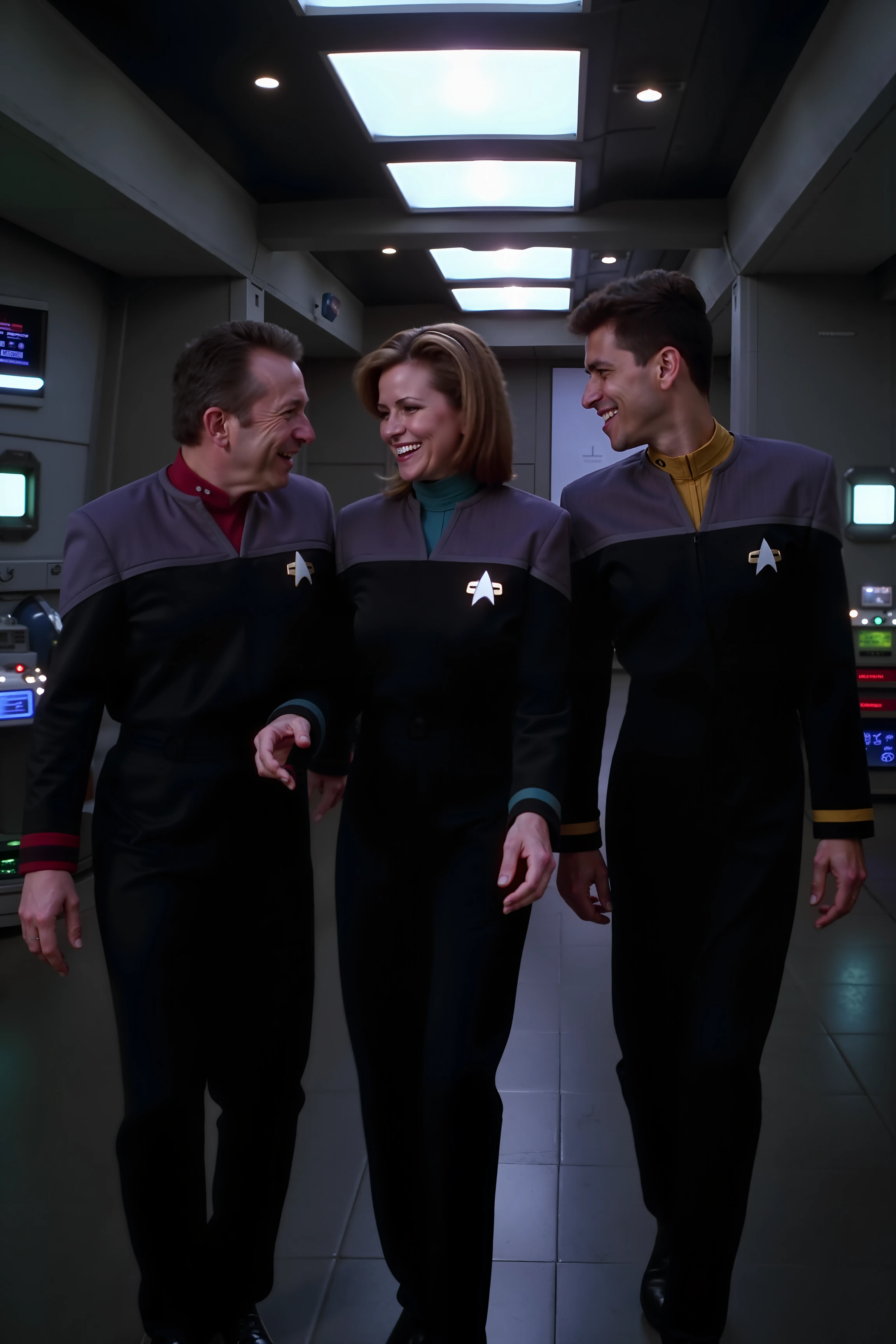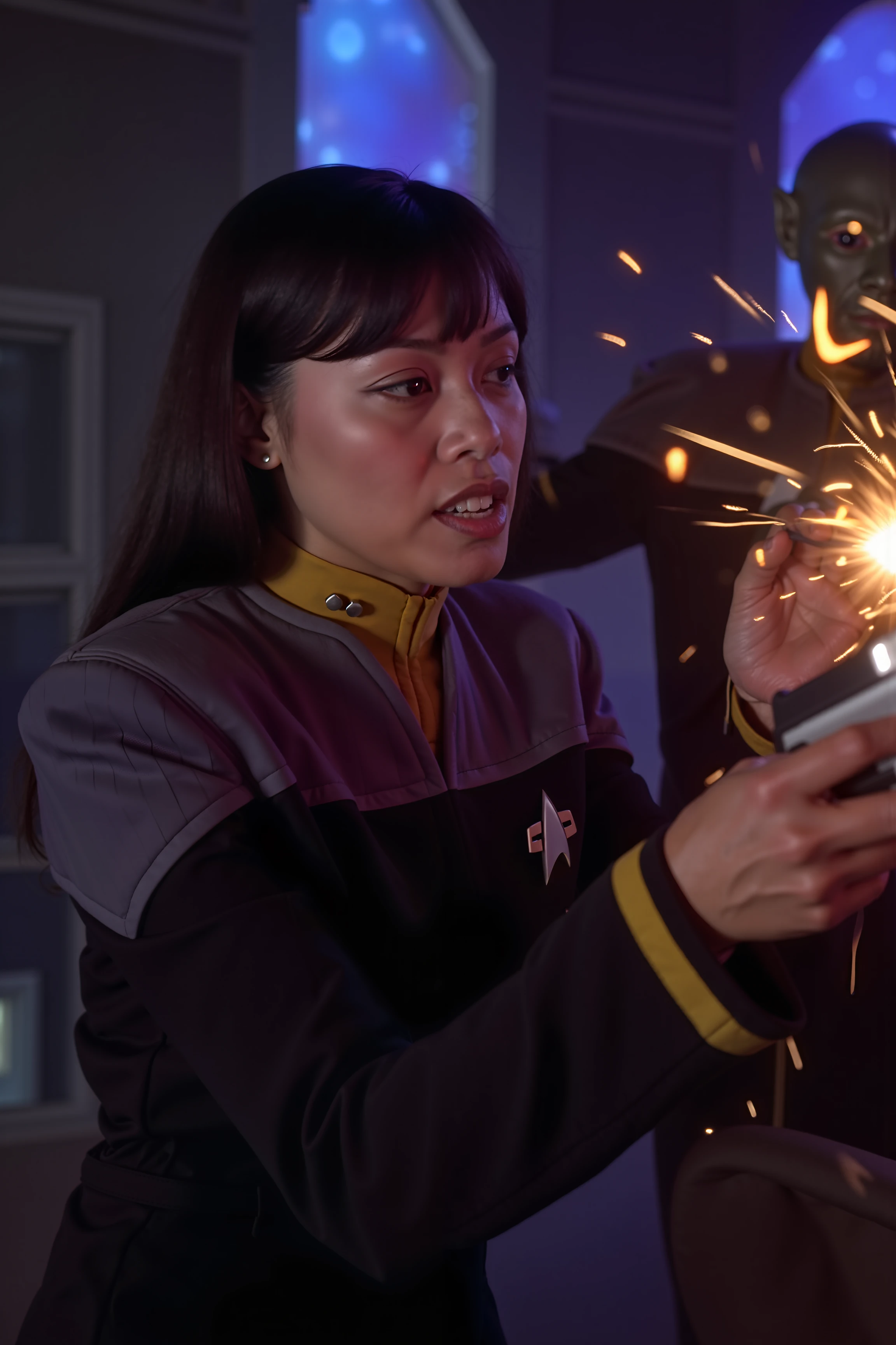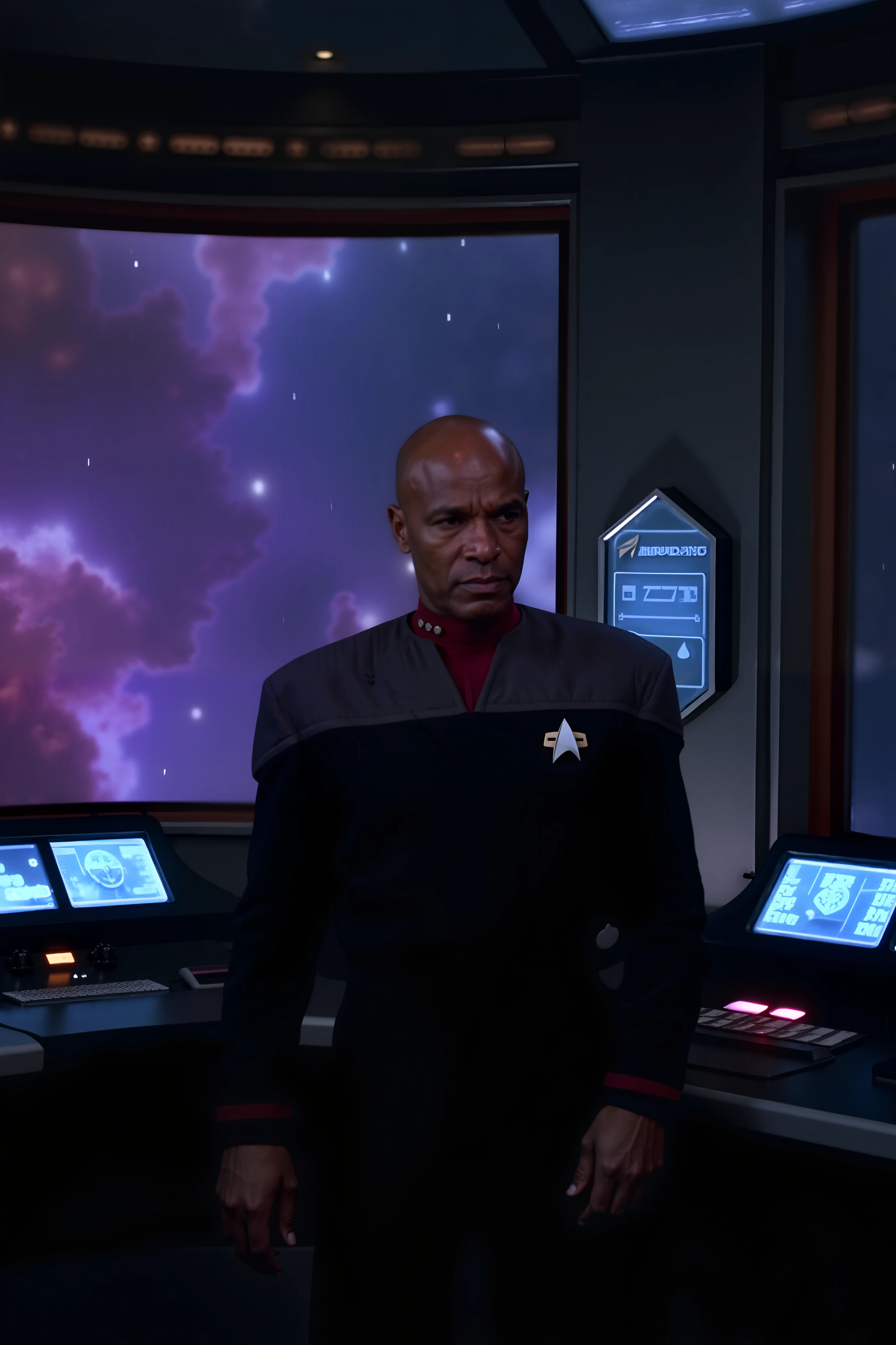 The most safe trigger phrase is "black DS9 uniform with gray shoulders and <COLOR> collar" where color is red,teal or yellow.