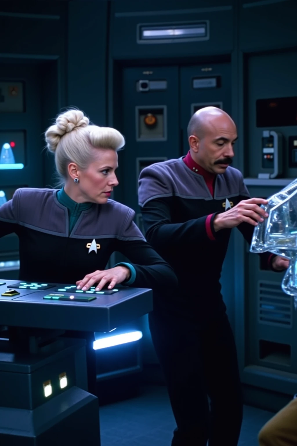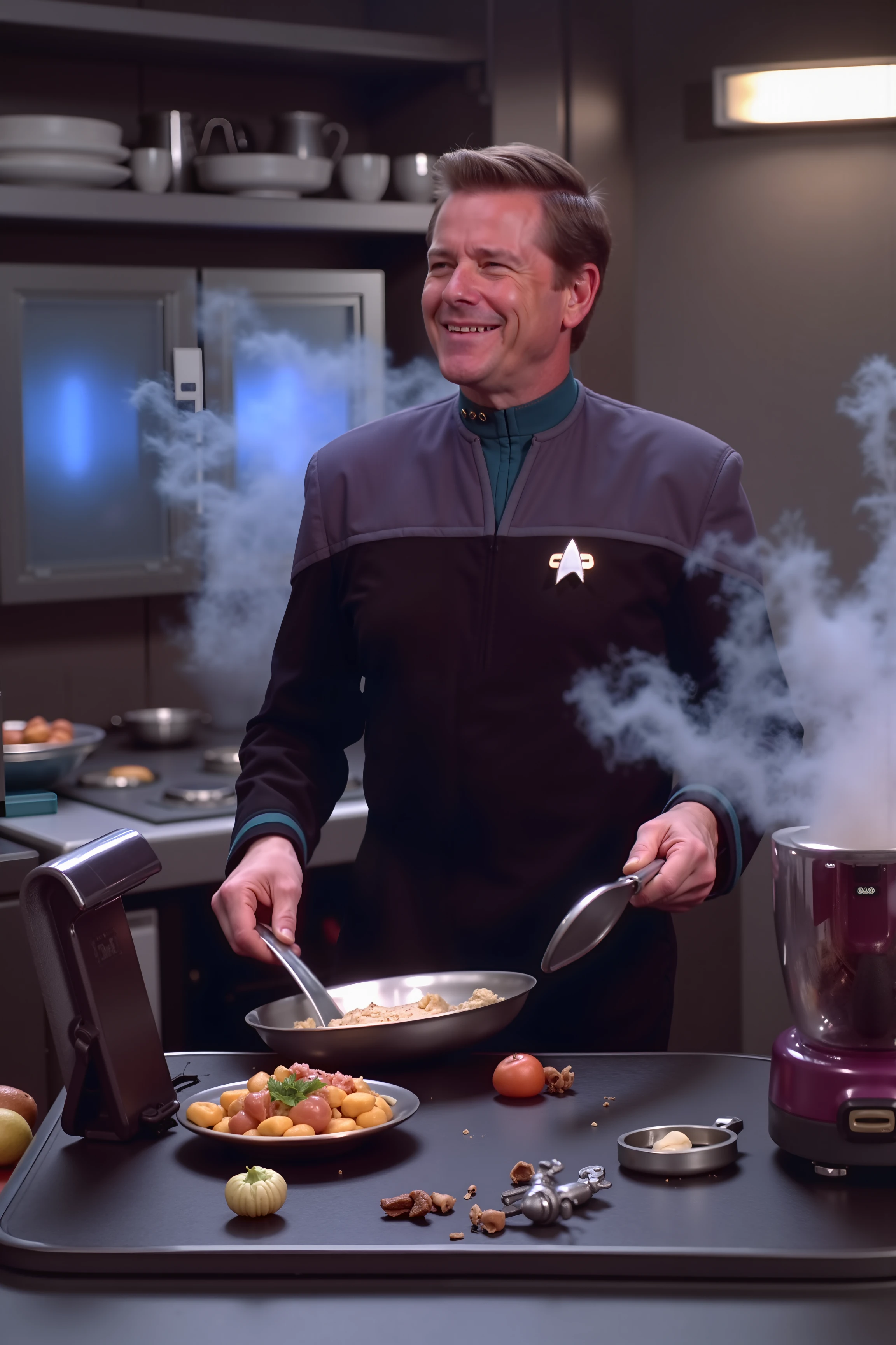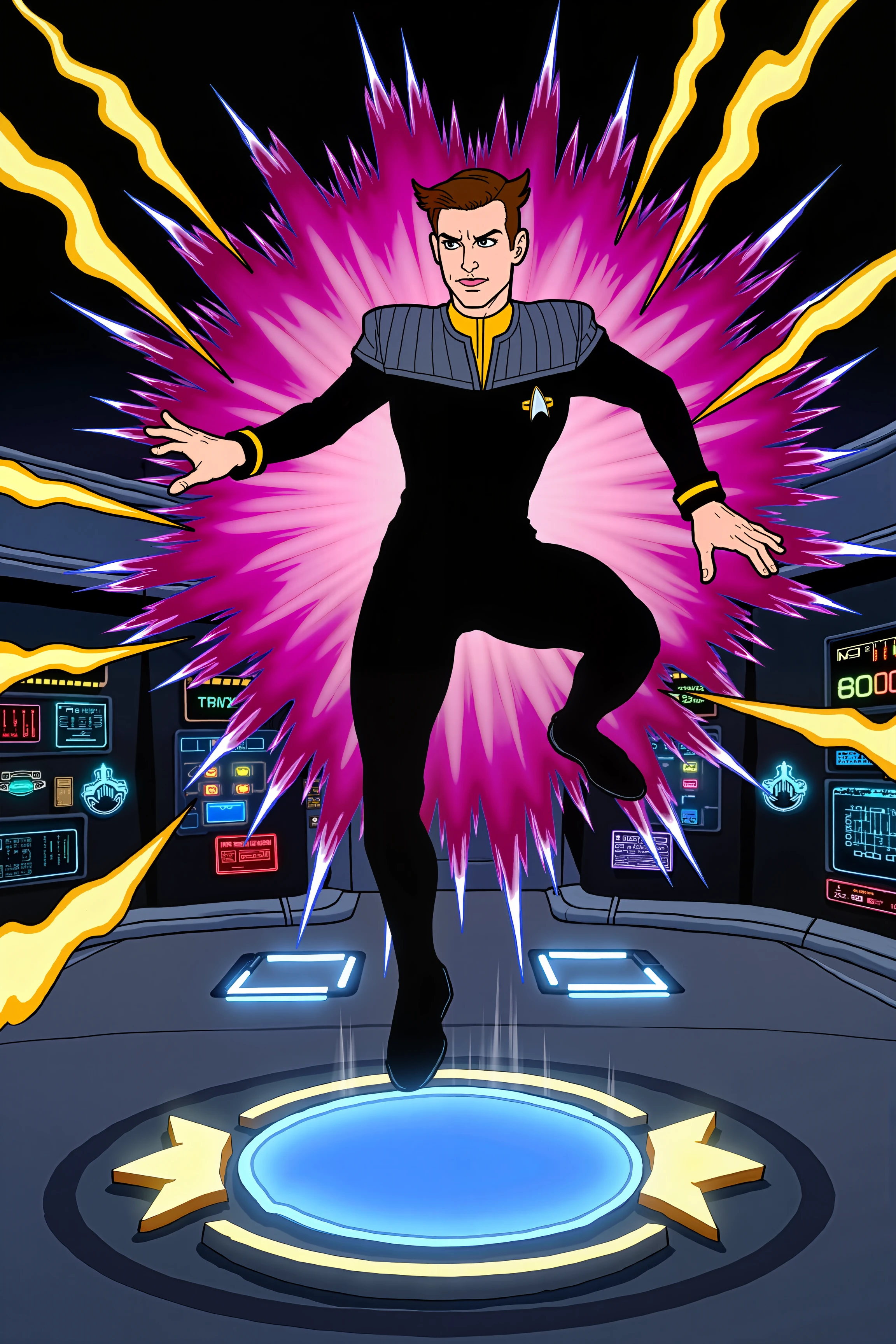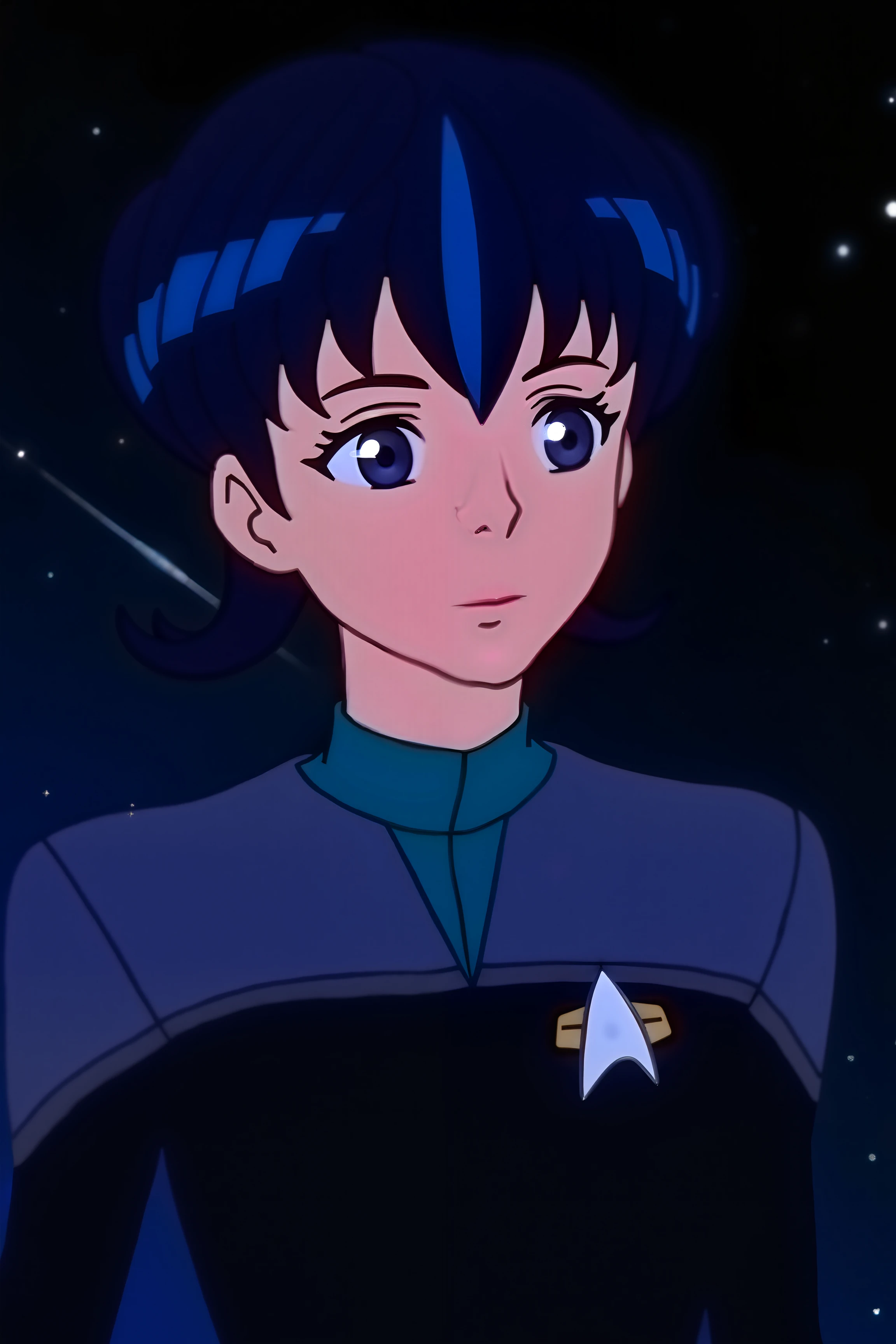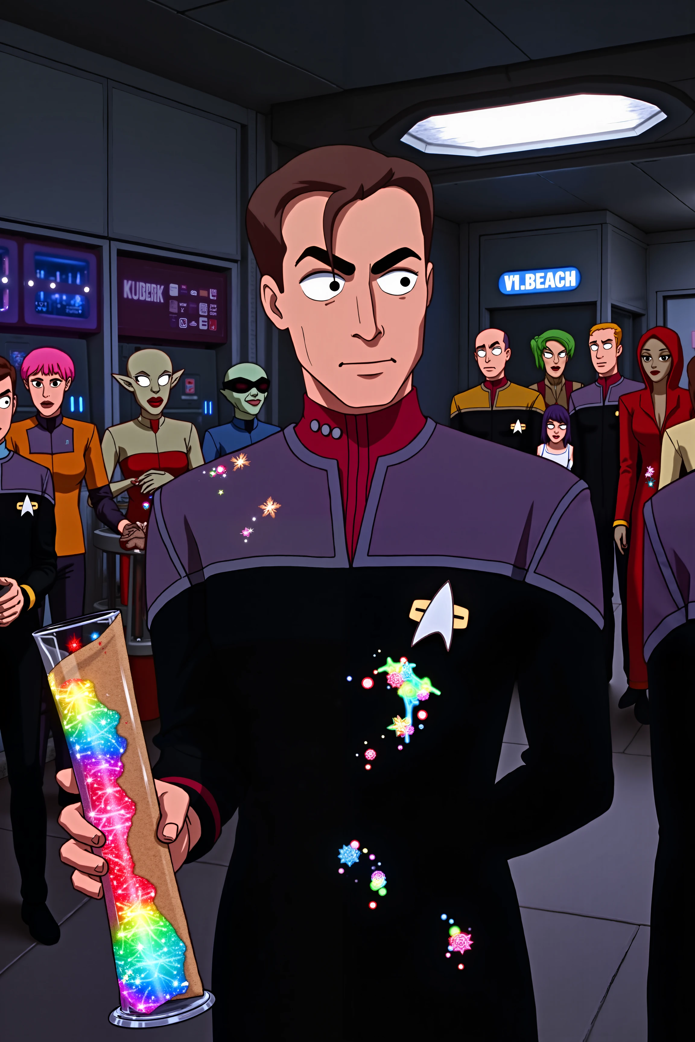 The most safe trigger phrase is "black DS9 uniform with gray shoulders and <COLOR> collar" where color is red,teal or yellow.