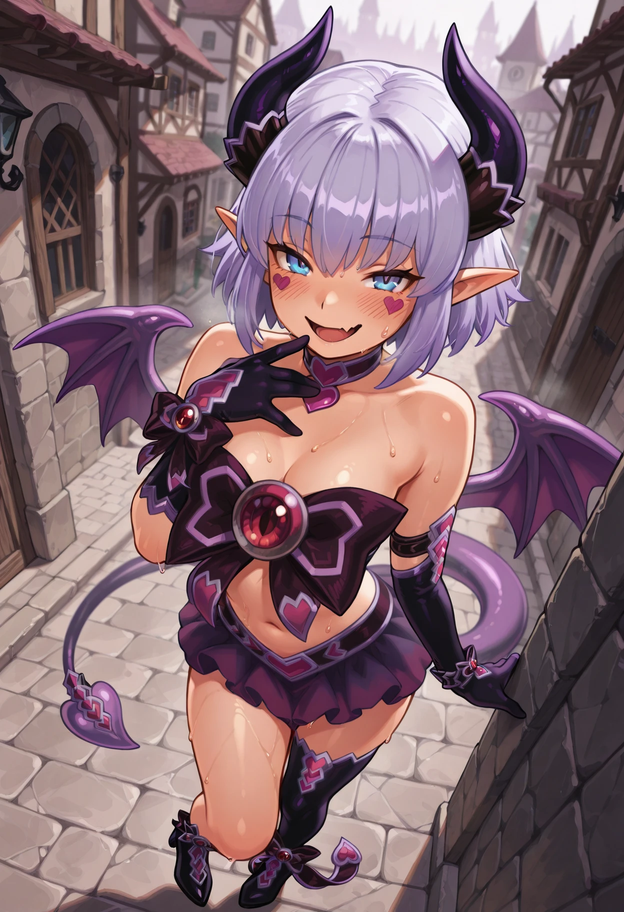 purple hair, short hair, blue eyes, navel, ???? shoulders, heart facial markπ Arch Imp Clothes: