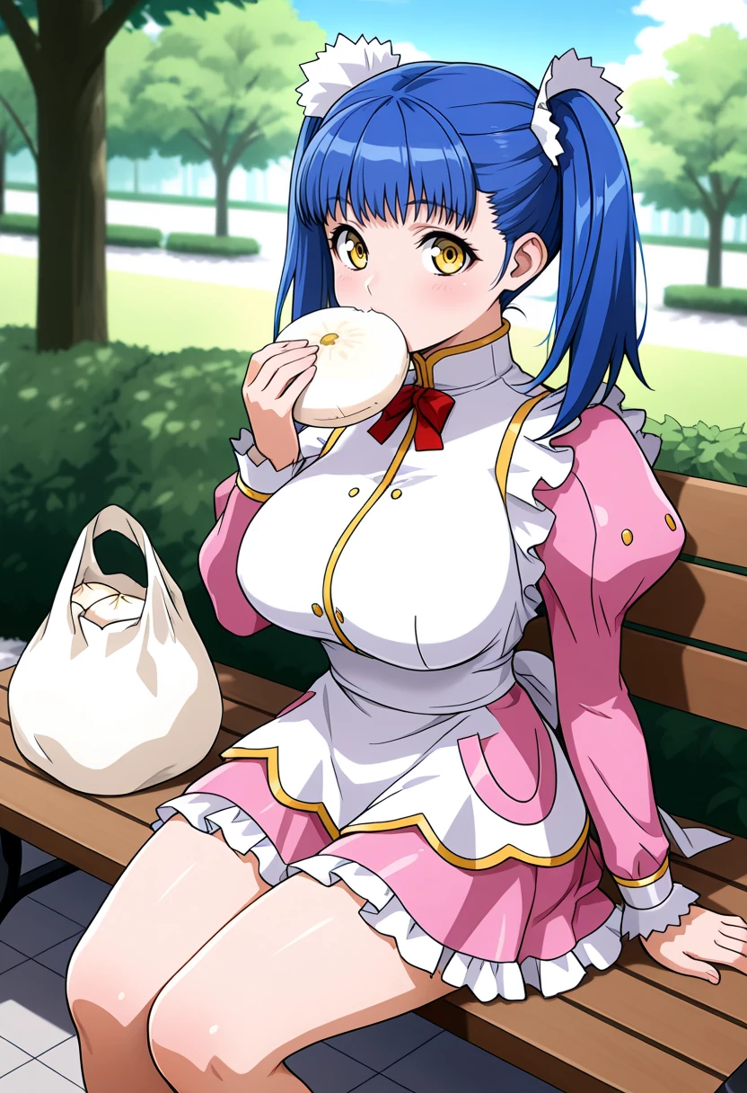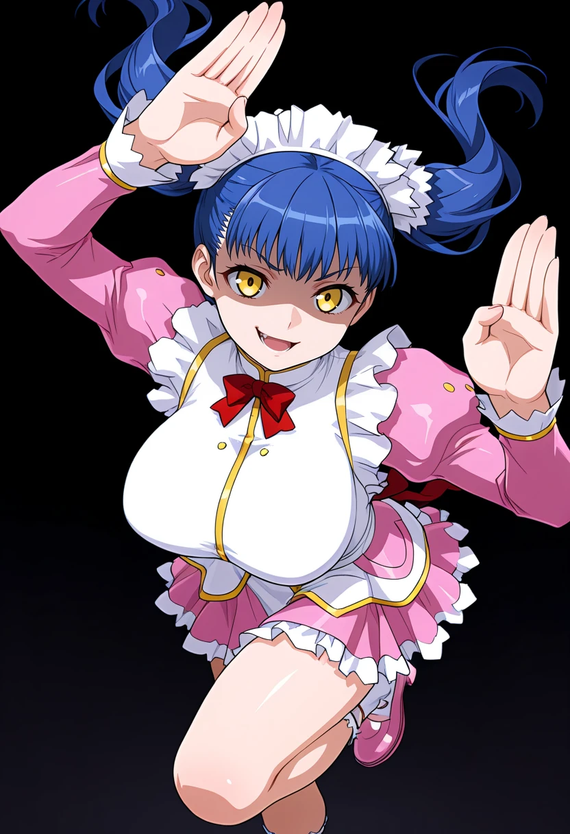 maid, pink dress, red bowtie, puffy long sleeves, frilled skirt, large breasts, blue hair, bangs, twintails, hair ornament, yellow eyes