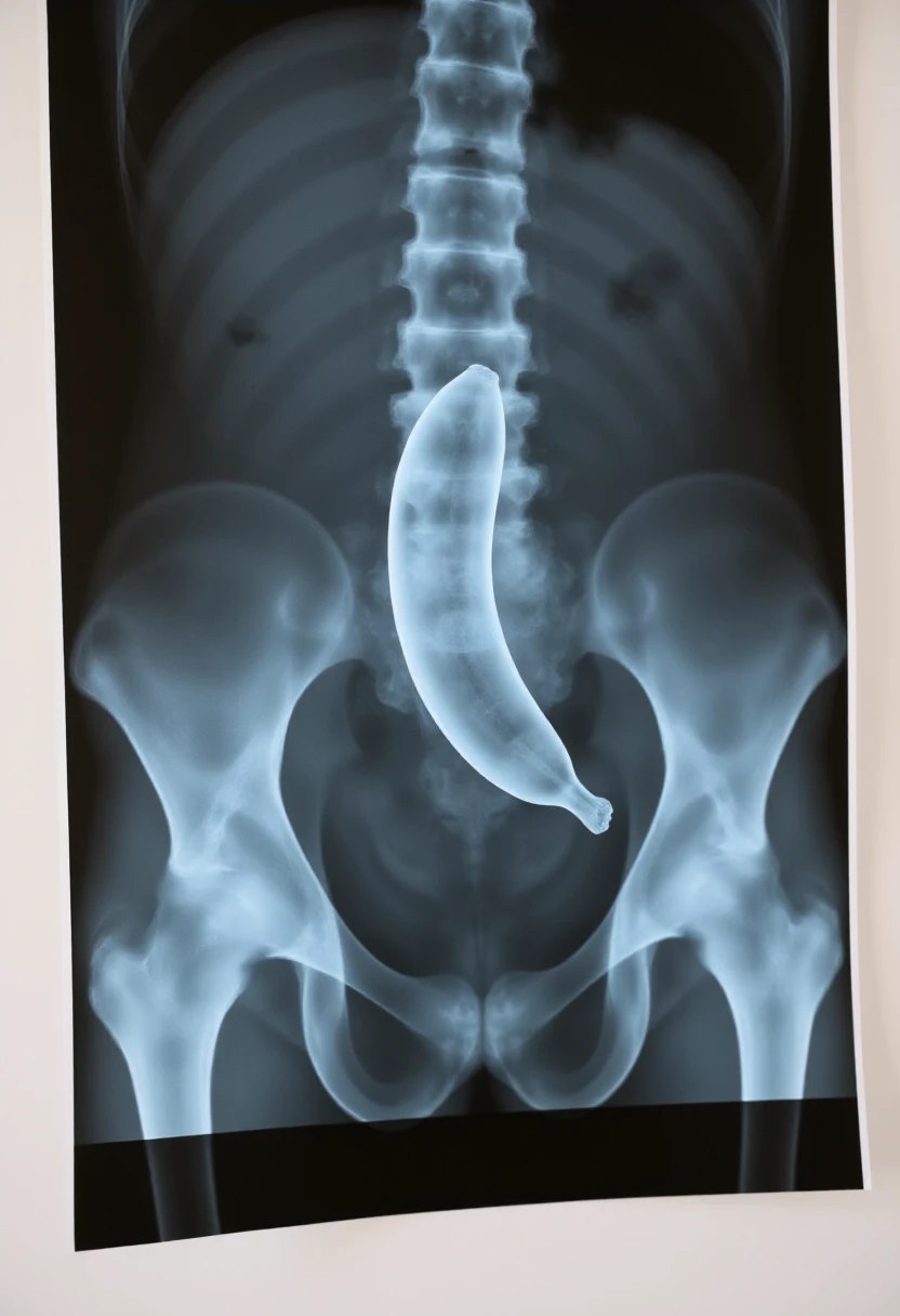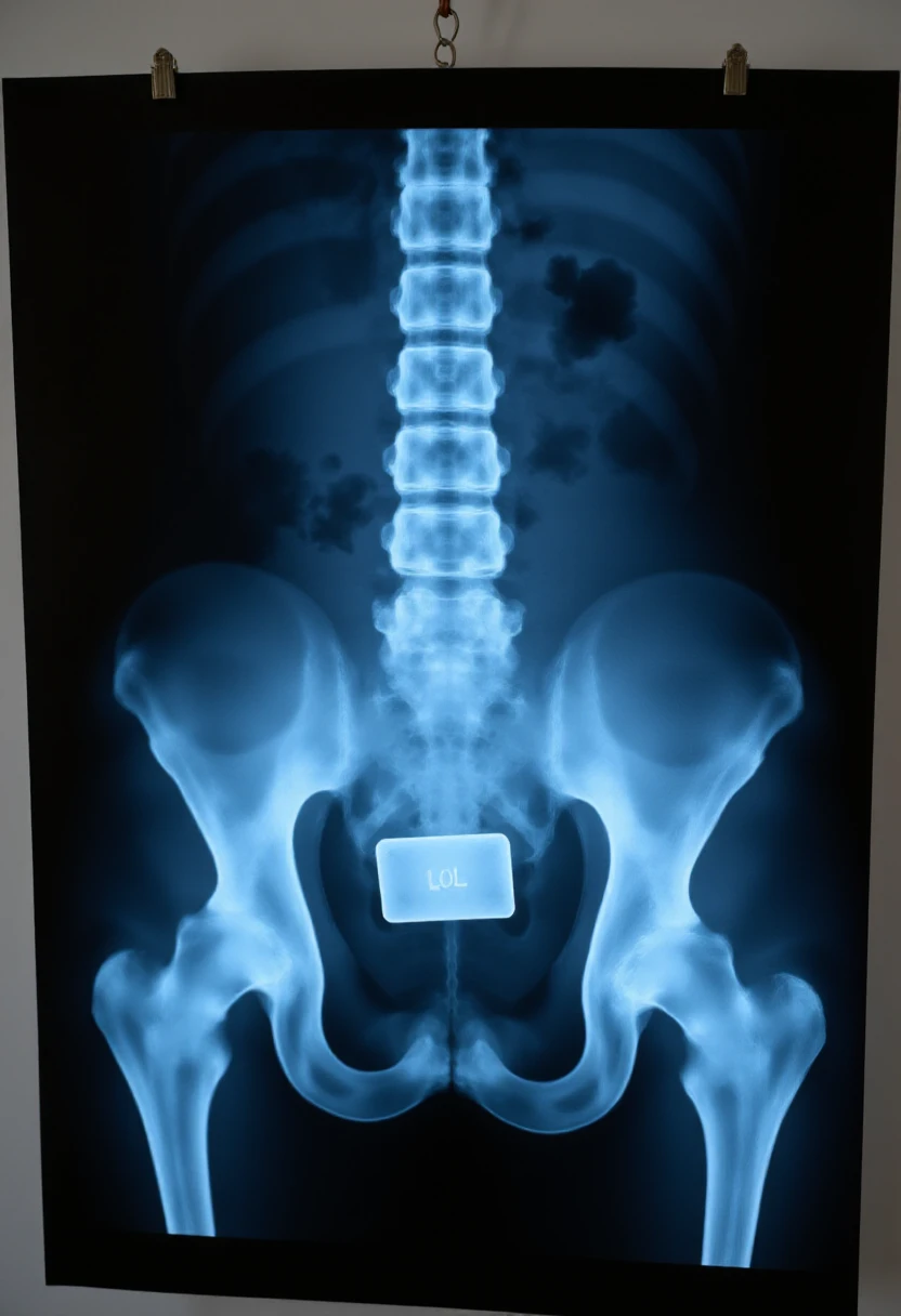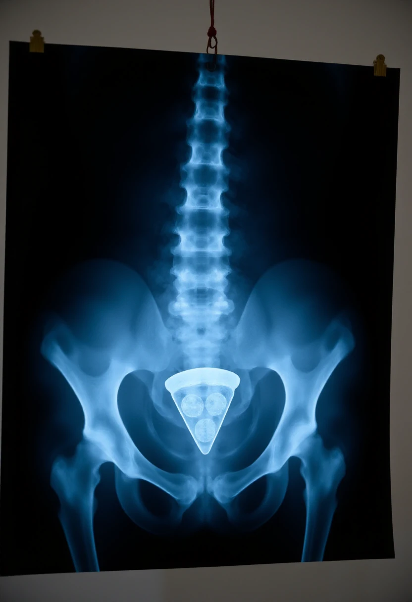 Photograph of a medical X-ray print, showing the silhouette of a human body. In the center of the pelvis, the x-ray image of a (OBJECT) is visible.