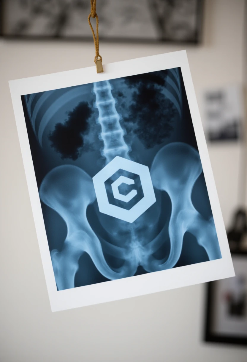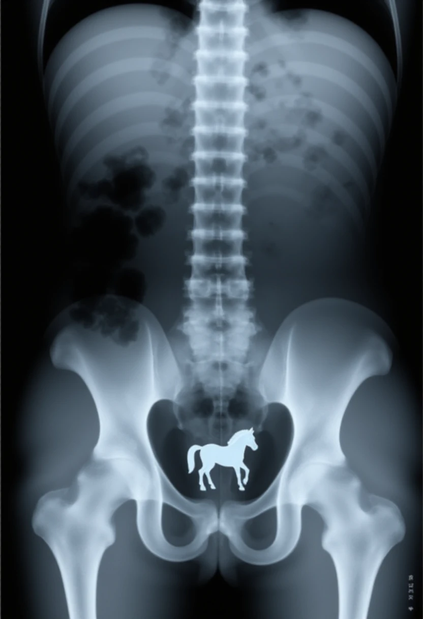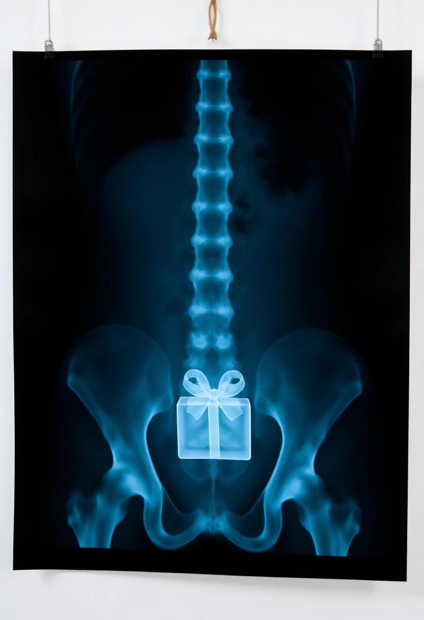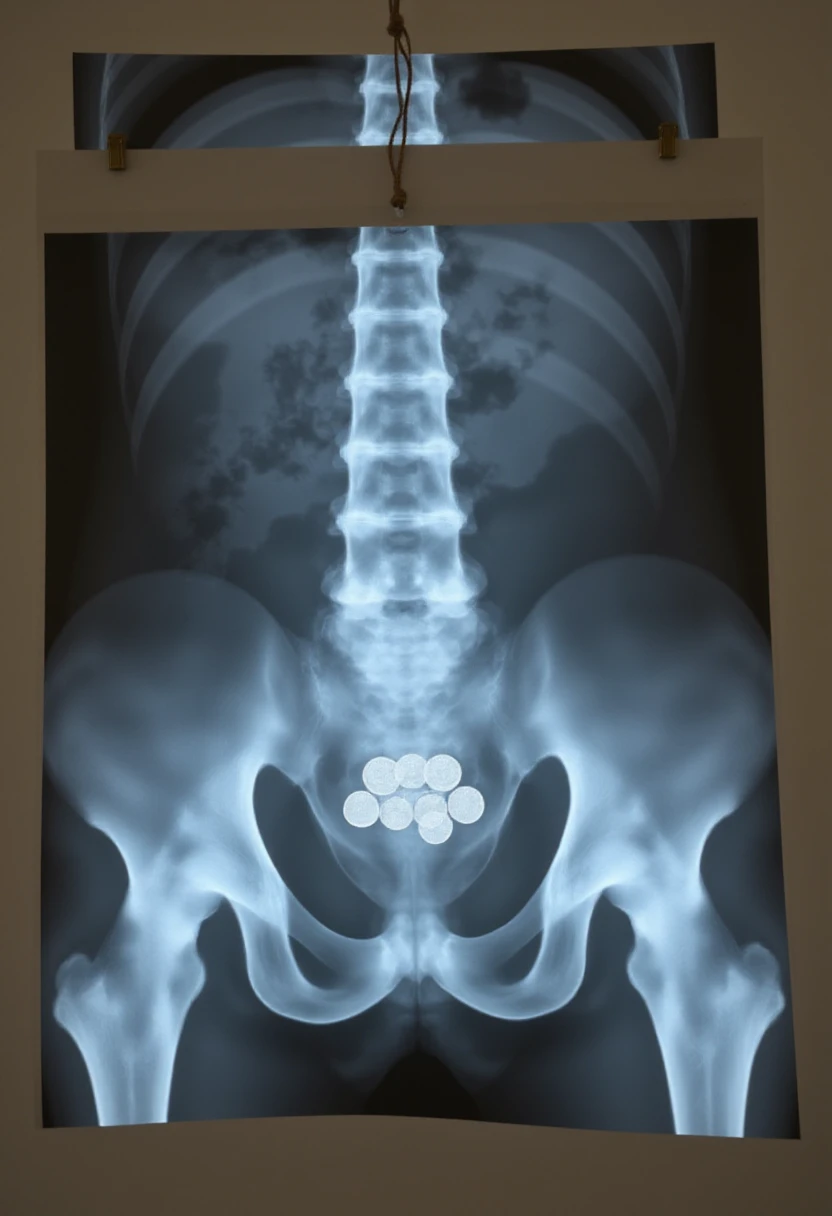 Photograph of a medical X-ray print, showing the silhouette of a human body. In the center of the pelvis, the x-ray image of a (OBJECT) is visible.