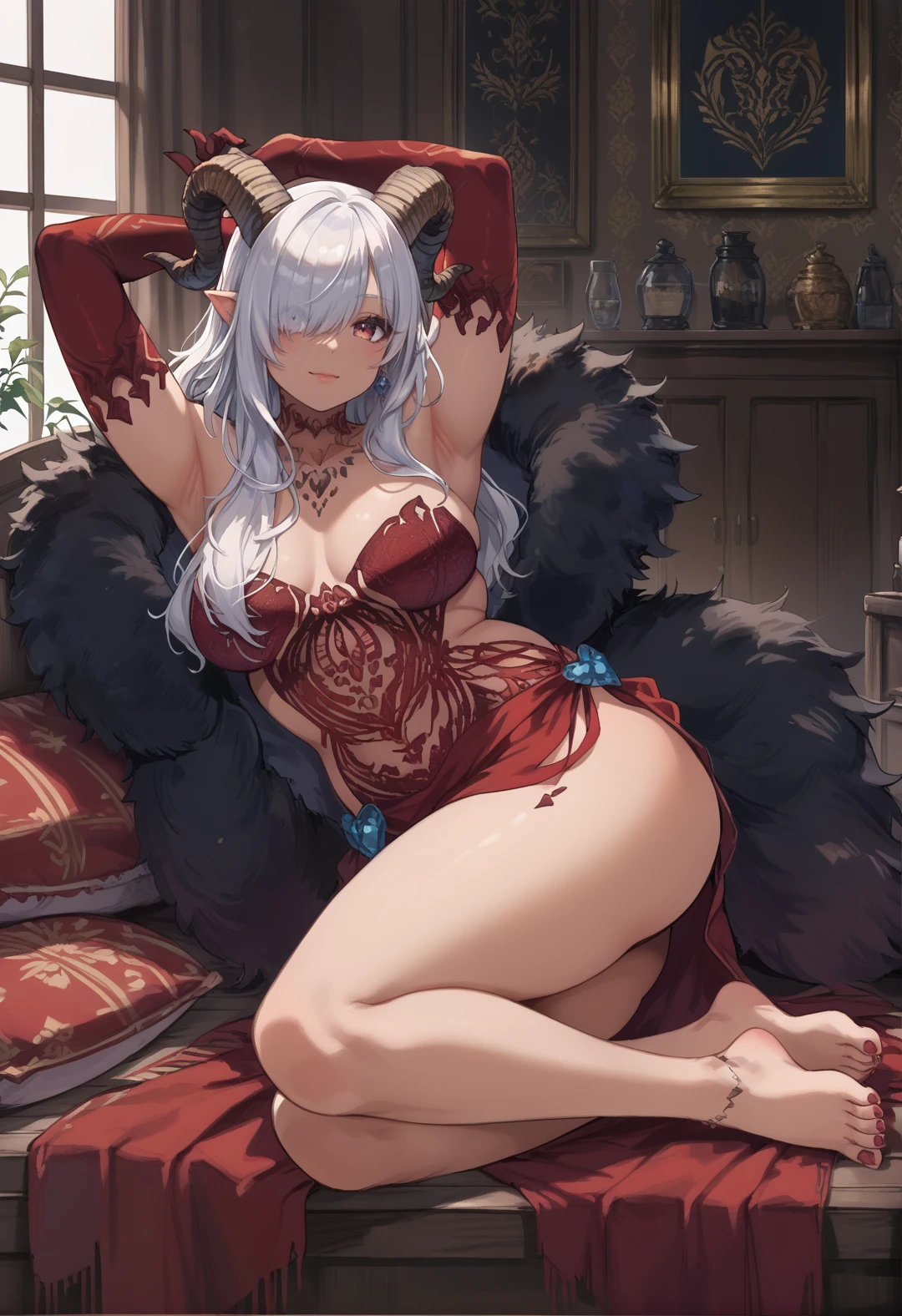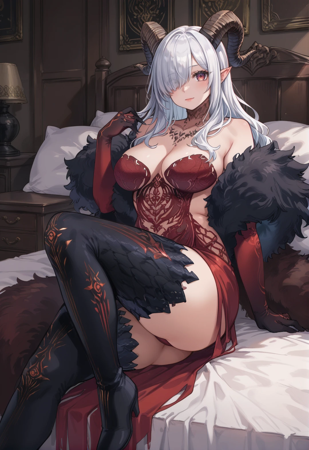Tags (clothes): Demonlord, black/white demon horns, black/red elbow gloves, black fur trim, black thigh boots, red crystal earrings, red strapless dress