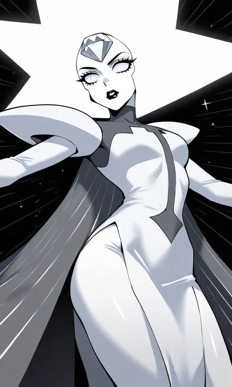 1girl,white theme,white skin, spiked hair, short hair, forehead jewel, white gemstone, white diamond,white hair, white eyes,black lips, white pupils, turtleneck dress, long sleeves, shoulder pads, striped cape, black cape, grey cape,sparkle, pelvic curtain, side slit,long dress, see-through