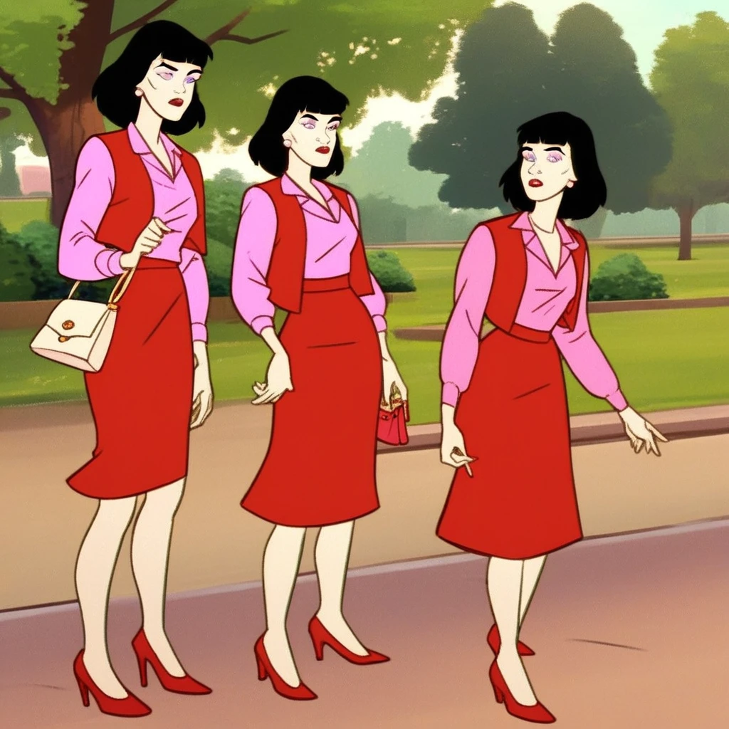 medium hair, black hair, blunt bangs, purple eyes, red lipstick, red high heels, pink shirt, red skirt, pencil skirt, red vest, purple stud earrings