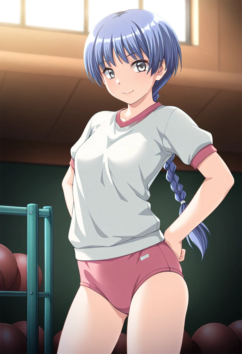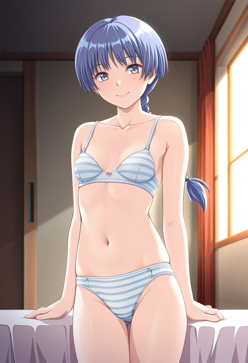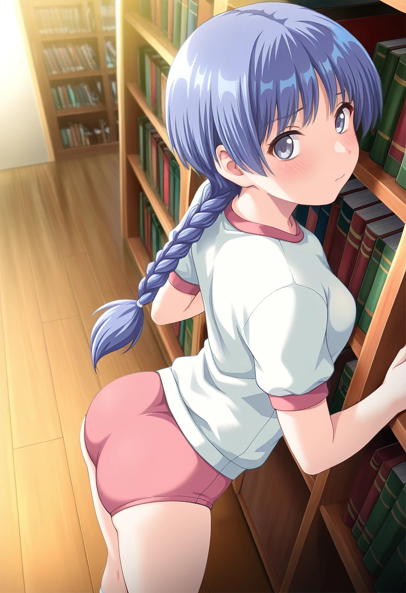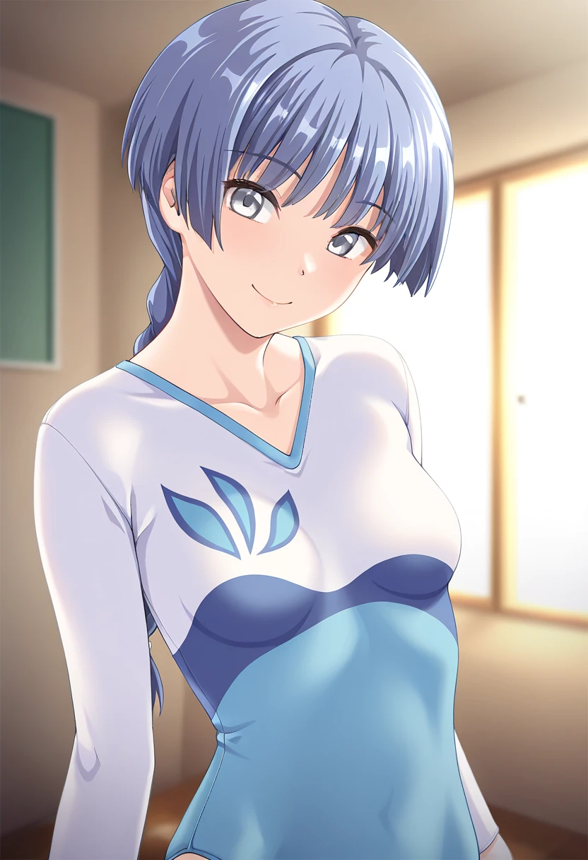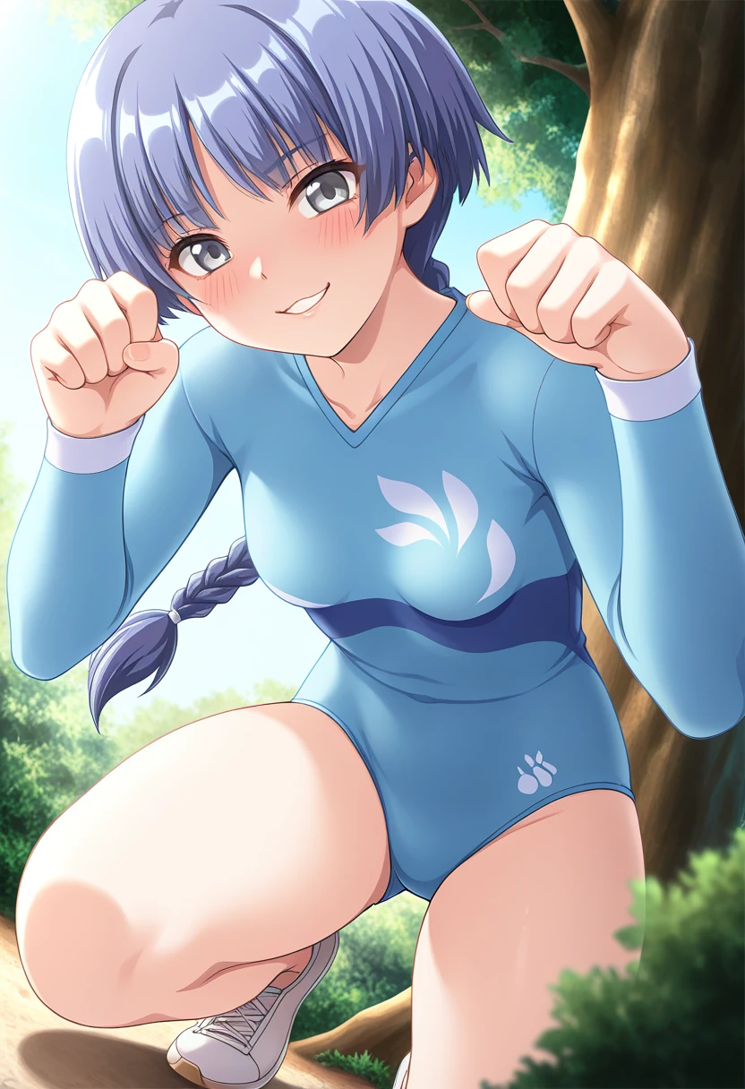 tenluww, grey eyes, blue hair, long hair, single braid, small breasts,