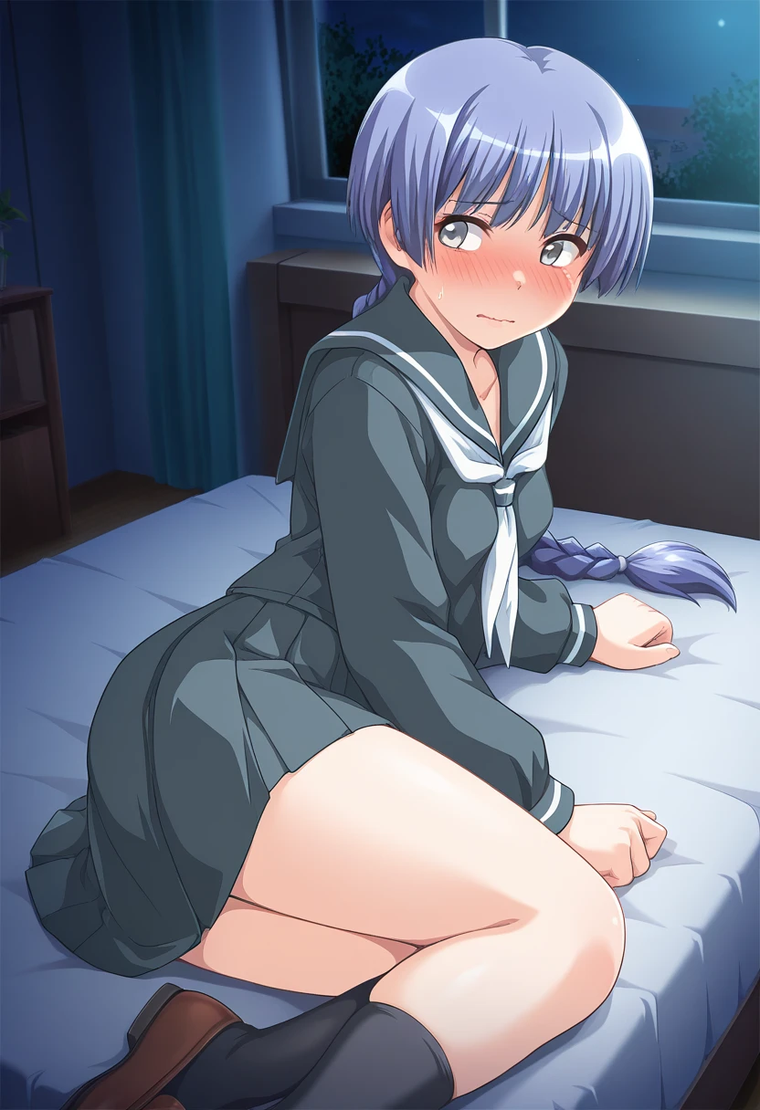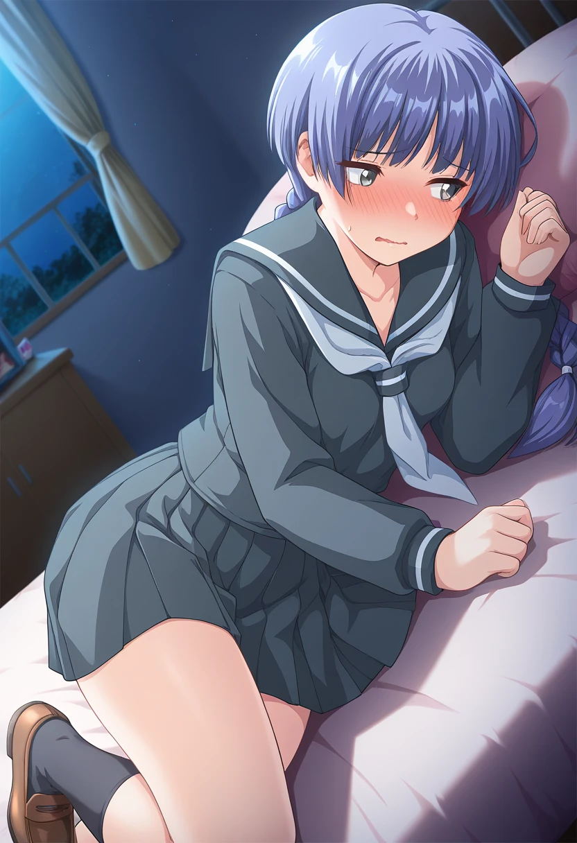 school uniform, dark grey serafuku, long sleeves, dark grey pleated skirt, black socks, shoes,