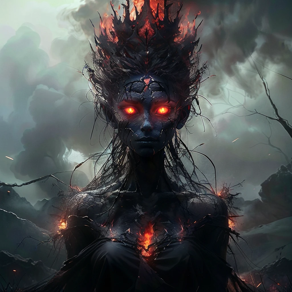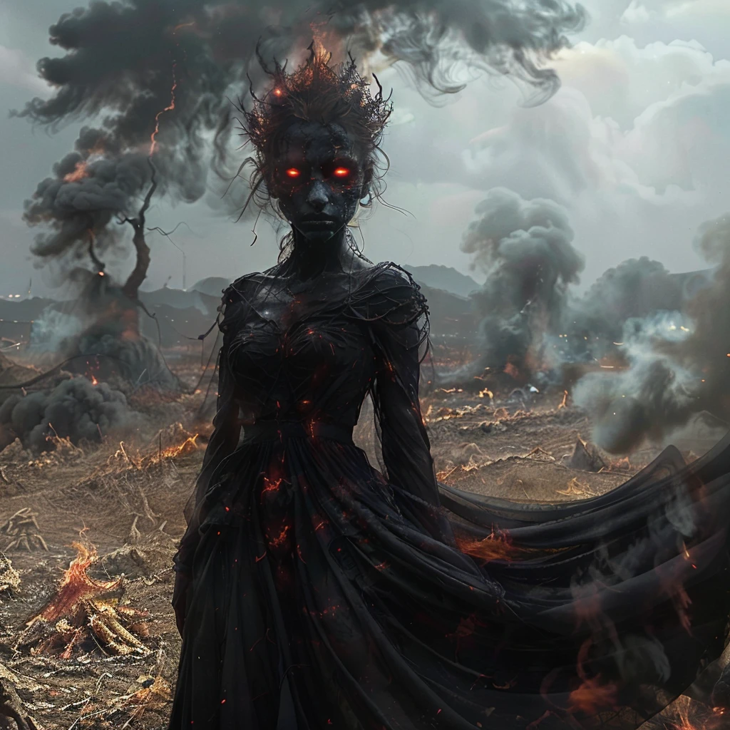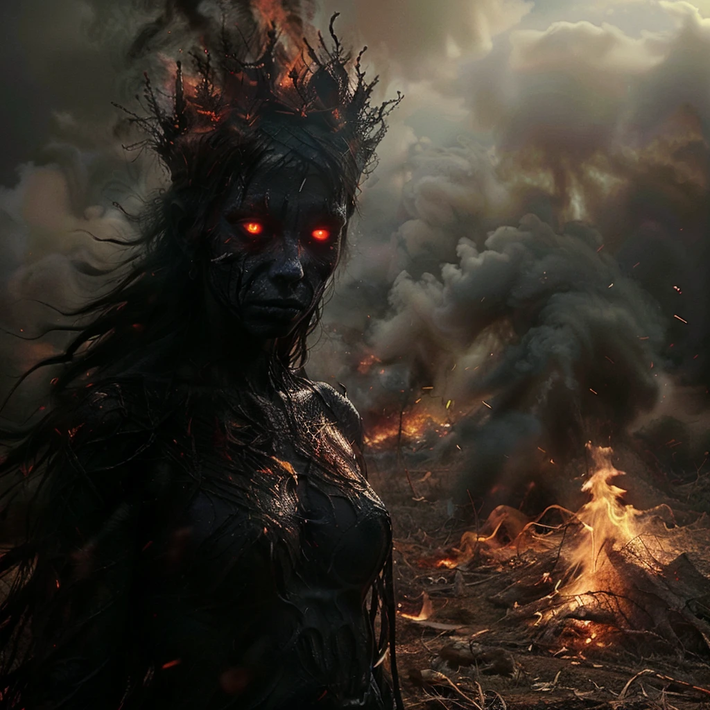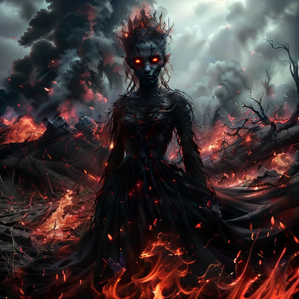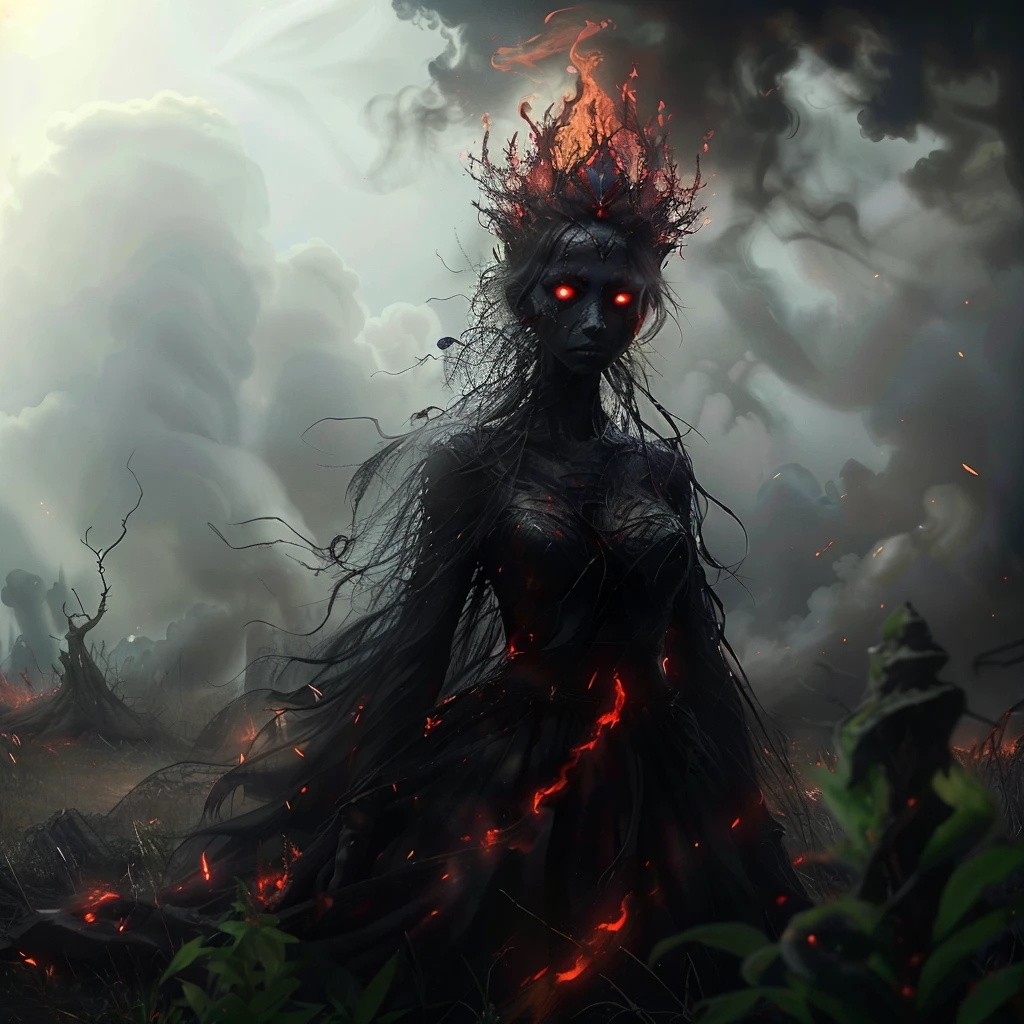 1girl, black hair, blurry, breasts, burning, cape, cloud, cloudy sky, colored skin, crown, dress, embers, explosion, fire, fog, glowing, glowing eyes, holding, holding sword, holding weapon, long hair, looking at viewer, male focus, monster, no humans, outdoors, pointy ears, red eyes, sarzuur, sinew, skirt, sky, smoke, solo, spot color, standing, tree, upper body, weapon,Description
