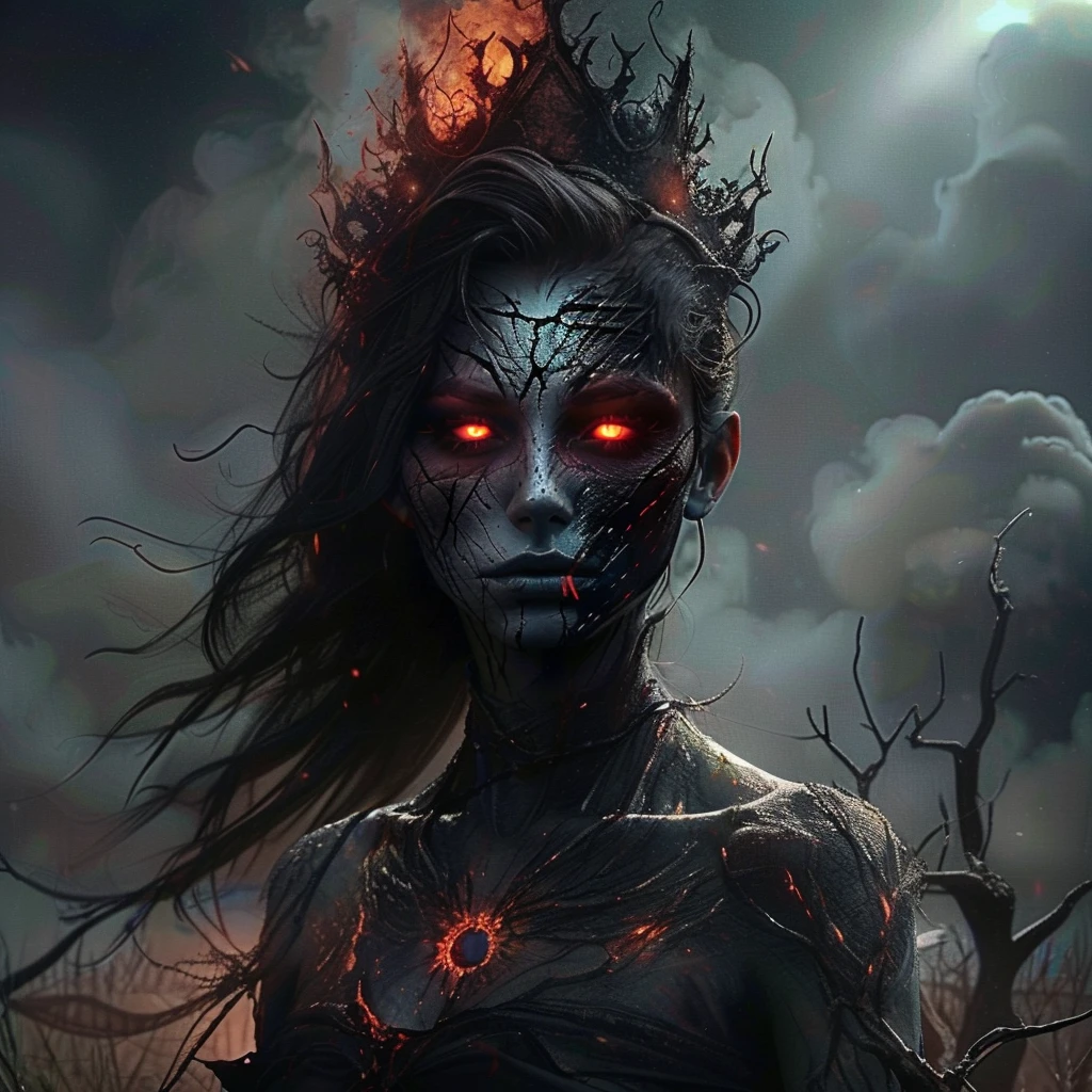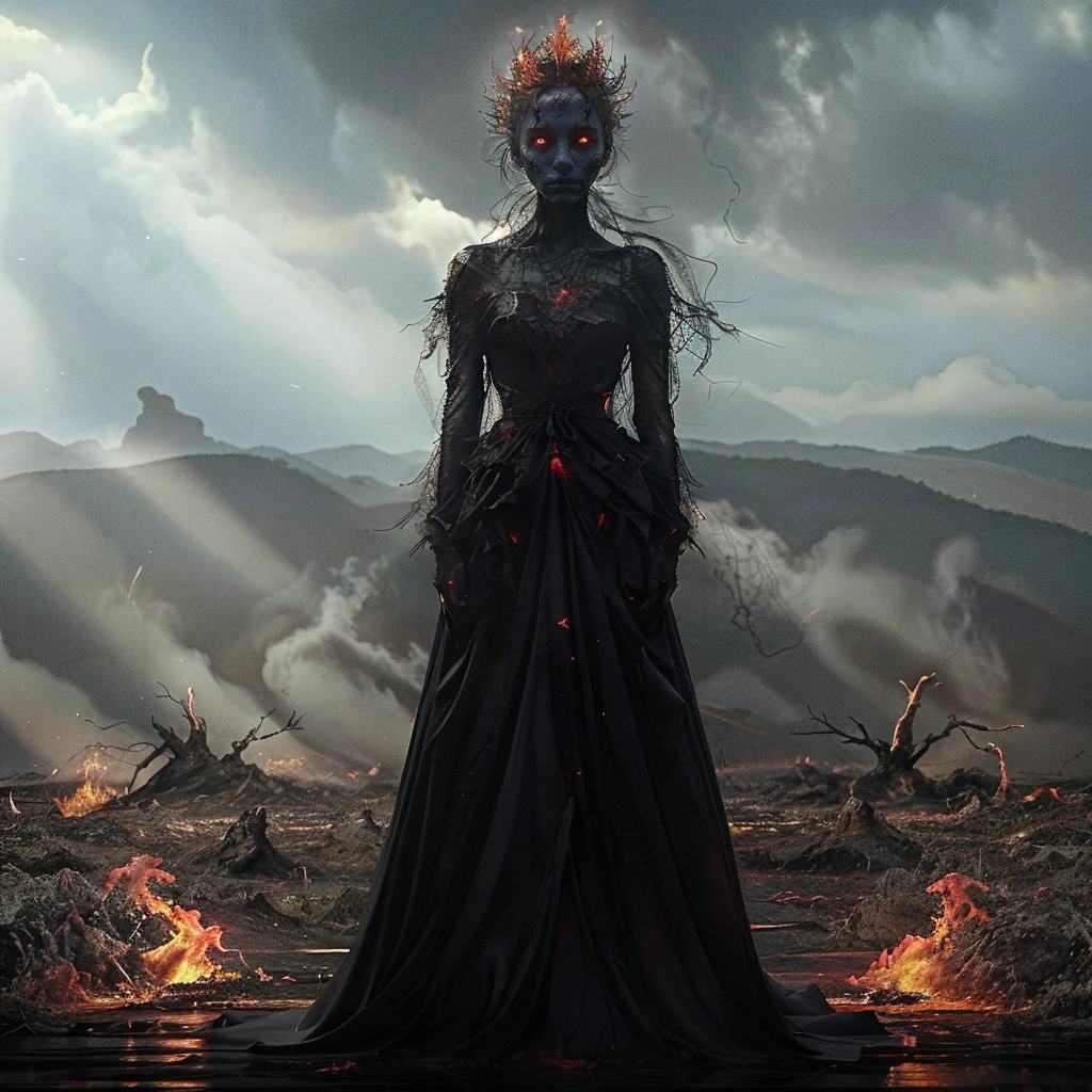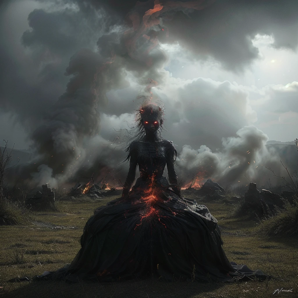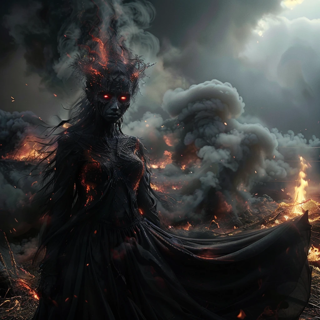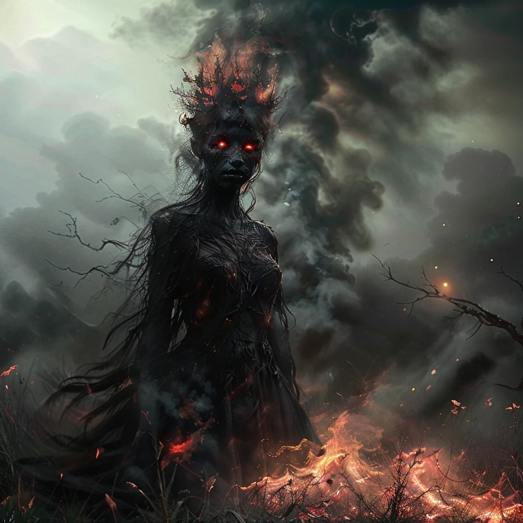 1girl, black hair, blurry, breasts, burning, cape, cloud, cloudy sky, colored skin, crown, dress, embers, explosion, fire, fog, glowing, glowing eyes, holding, holding sword, holding weapon, long hair, looking at viewer, male focus, monster, no humans, outdoors, pointy ears, red eyes, sarzuur, sinew, skirt, sky, smoke, solo, spot color, standing, tree, upper body, weapon,Description