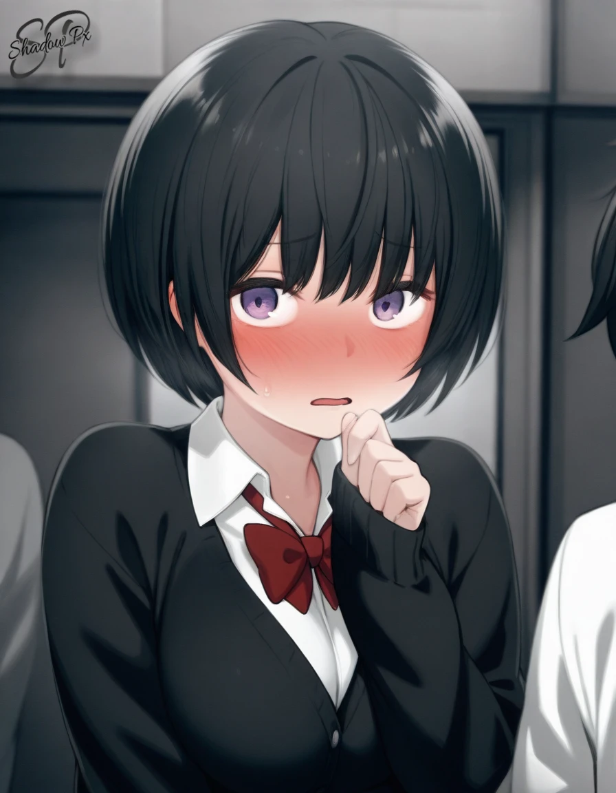 Yuk1k0, short hair, black hair, purple eyes, 1girl, large breasts, bob cut, hair between eyes,