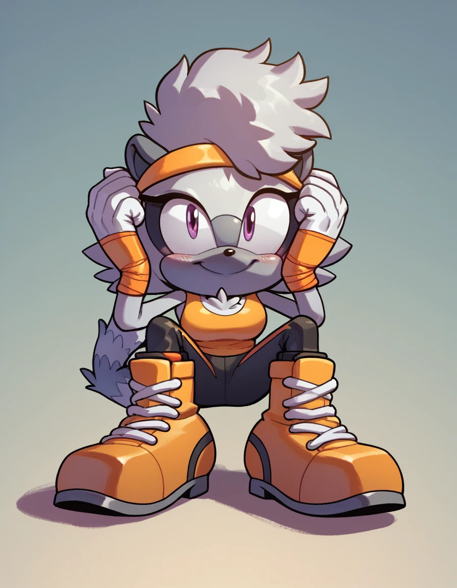 Whisper Outfit: white tank top, grey leggings, knee pads, grey boots