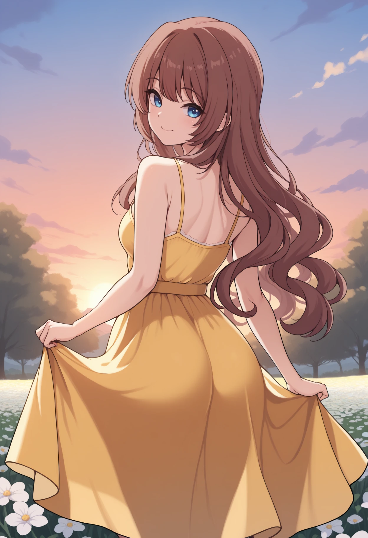 long hair, brown hair, wavy hair, blue eyes