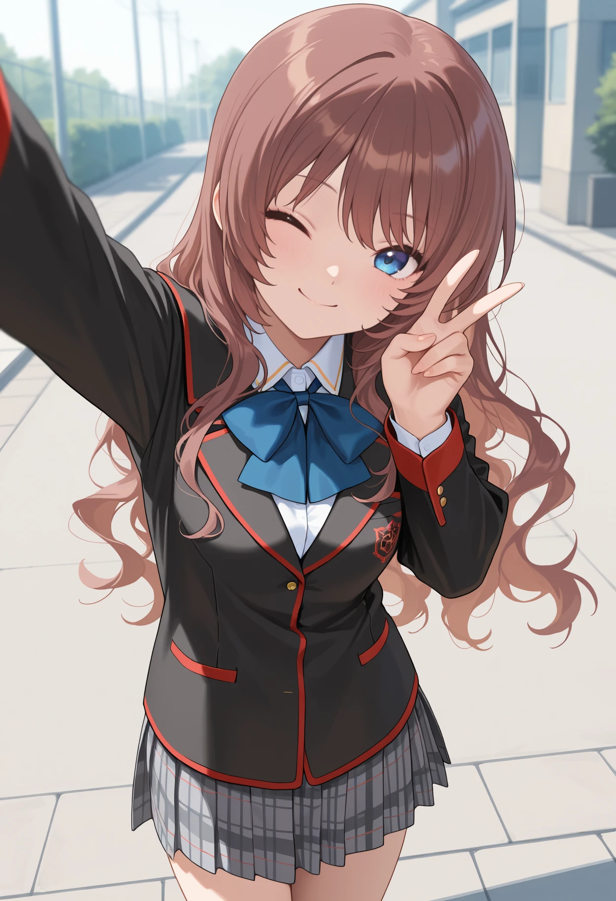 Default Outfit: school uniform, black jacket, blazer, long sleeves, white shirt, collared shirt, blue bowtie, grey skirt, plaid skirt, pleated skirt
