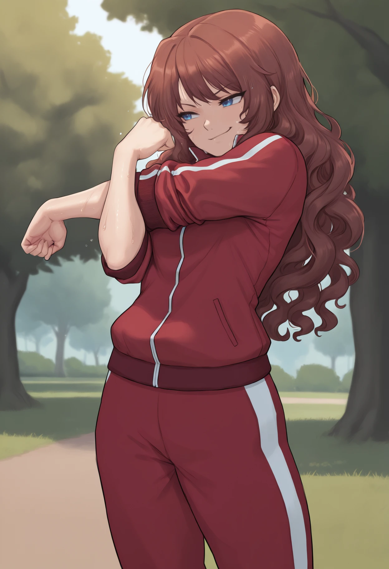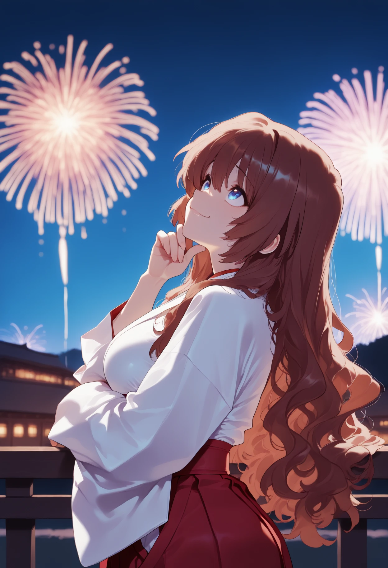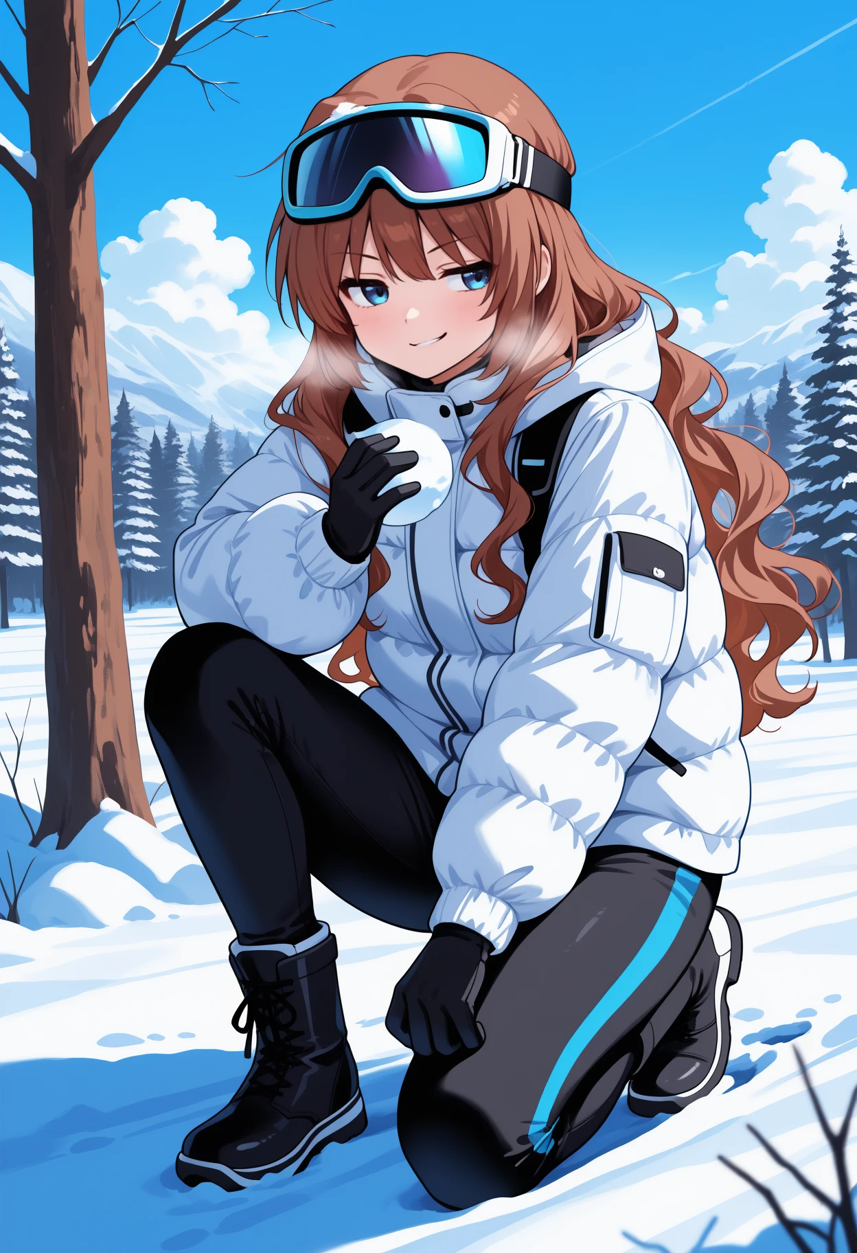 Appearance: long hair, brown hair, wavy hair, blue eyes