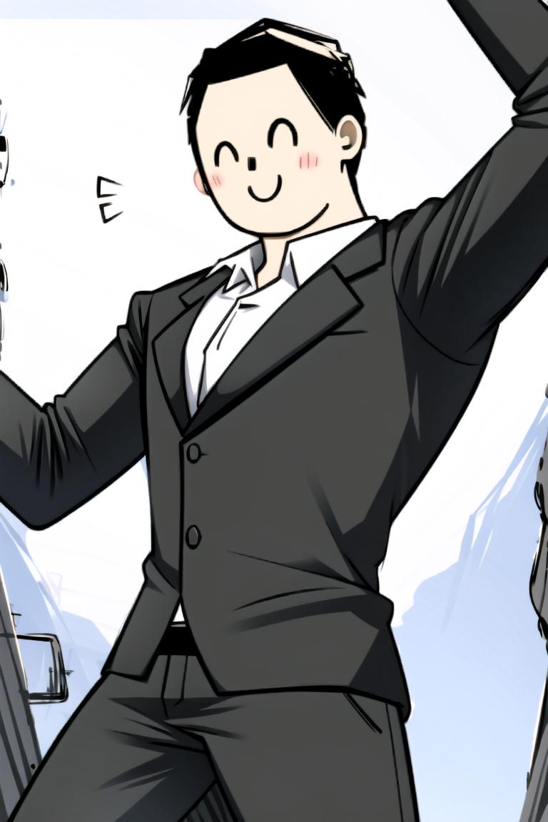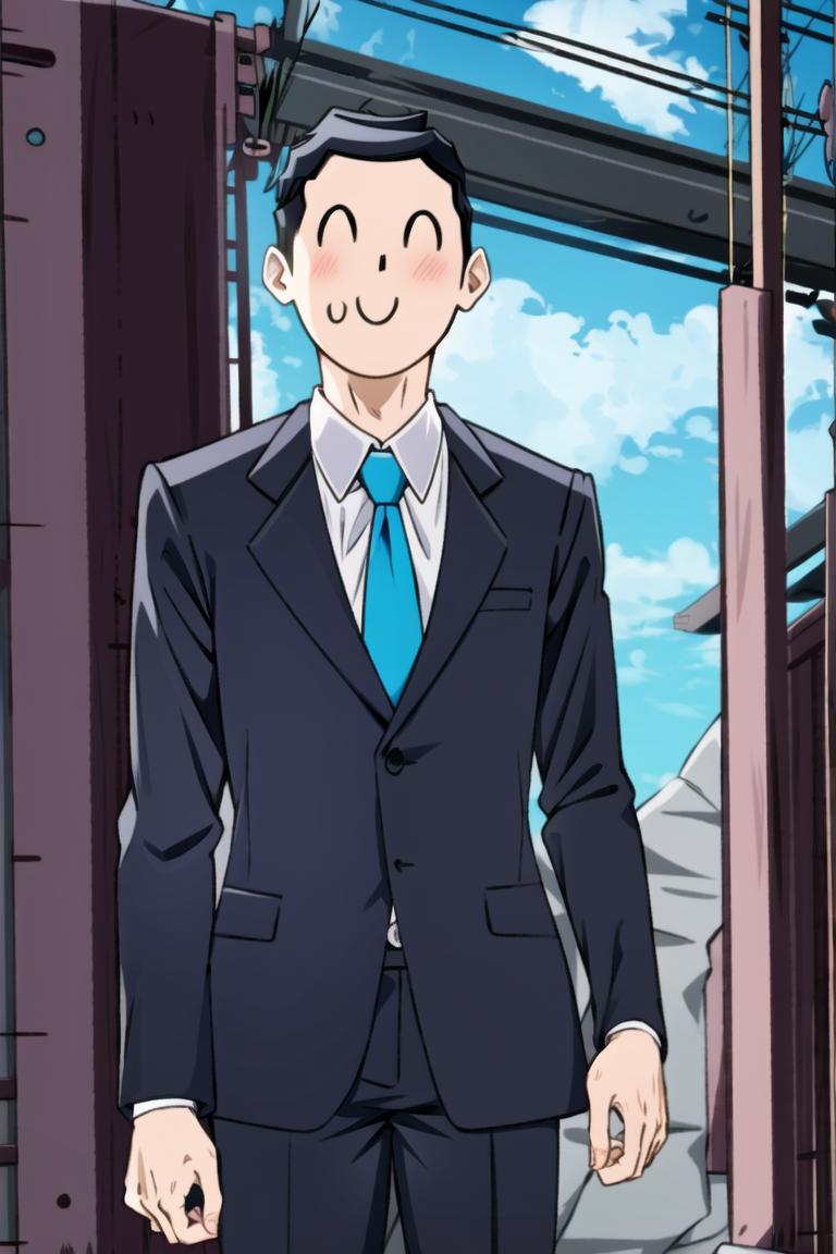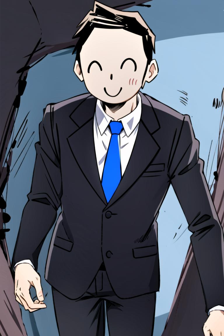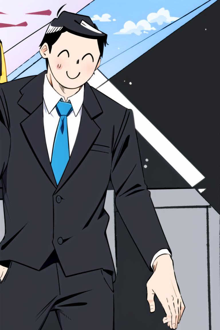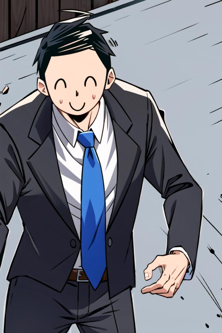 recommended prompt: sensei, smile, male focus, ^ ^, suit, black pants, closed eyes, blue necktie, black hair