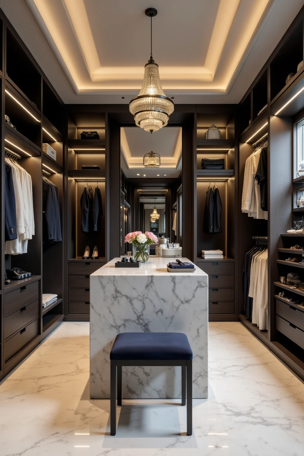 7. High - end interior design style, a walk - in closet with custom shelving, a central island for accessories, and soft, ambient lighting.