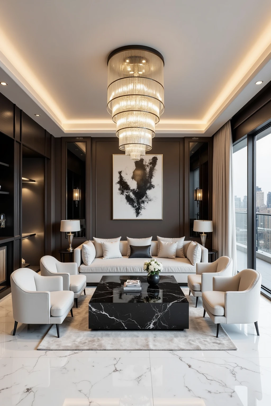 1. High - end interior design style, a living room with marble flooring, plush sofas in neutral tones, and a statement chandelier hanging above a modern coffee table.