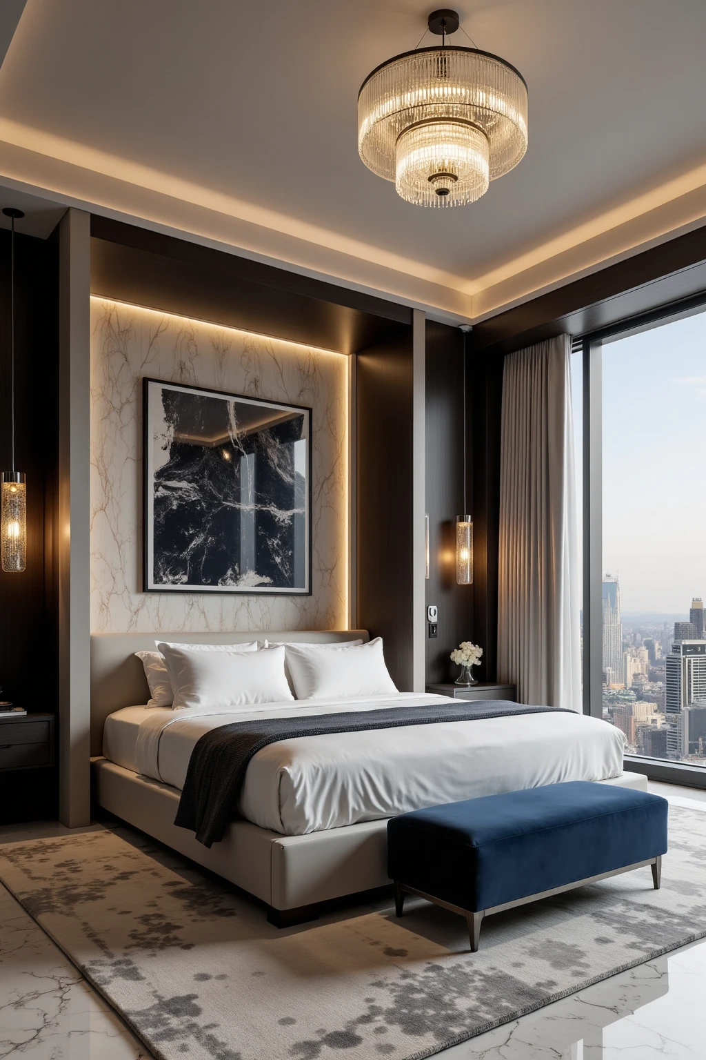 2. High - end interior design style, a bedroom featuring a canopy bed, dark wood nightstands, and a large, framed abstract art piece on the wall.