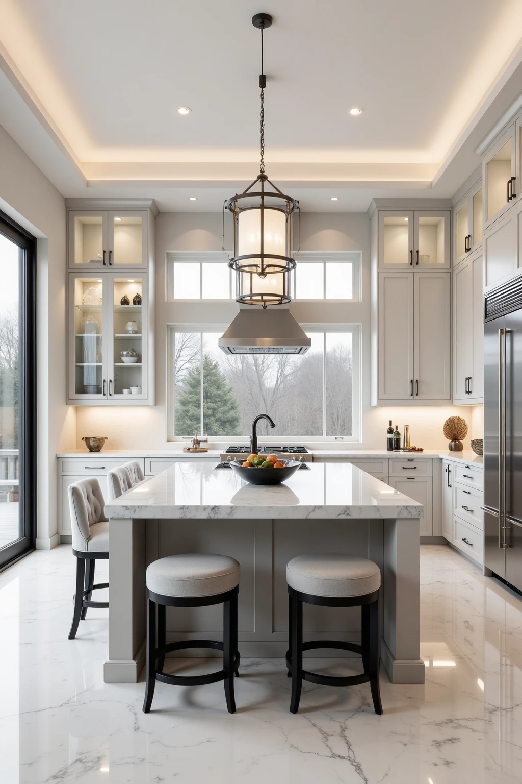 6. High - end interior design style, a kitchen with stainless - steel appliances, white cabinetry, and a large kitchen island with bar stools.