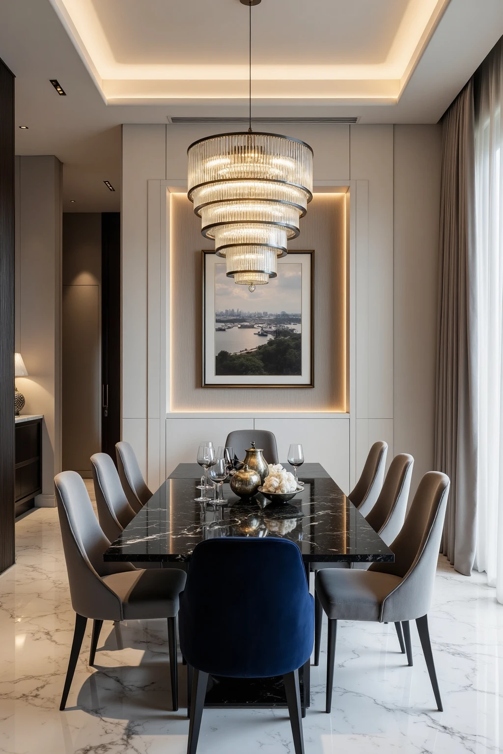 3. High - end interior design style, a dining area with a long, glossy table, elegant upholstered chairs, and a contemporary pendant light overhead.