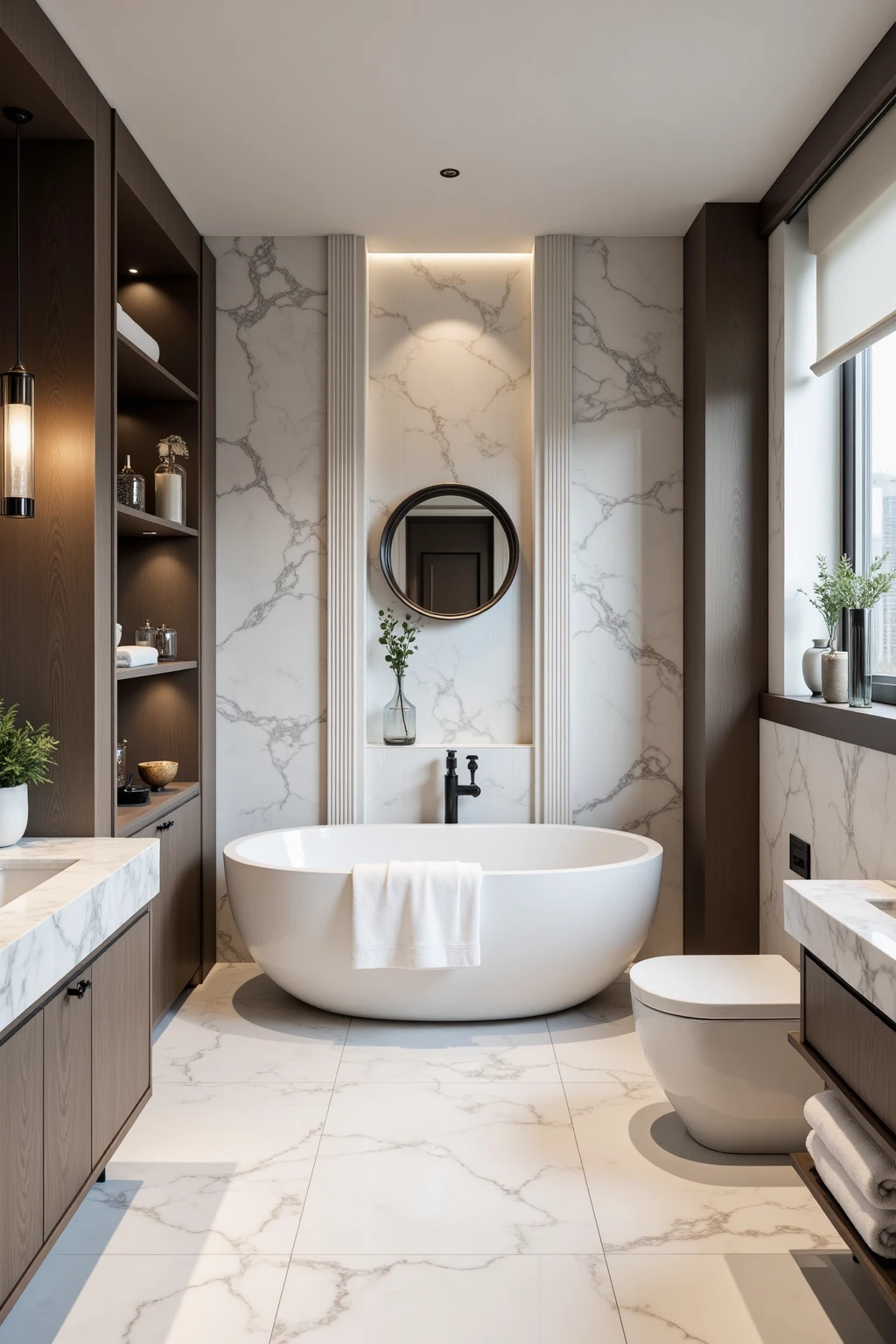 5. High - end interior design style, a bathroom with a freestanding bathtub, marble countertops, and sleek, modern fixtures.