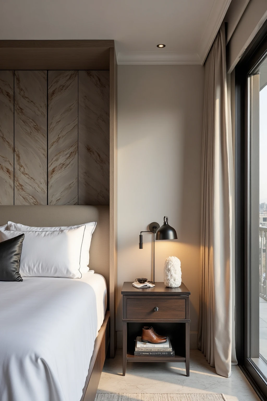 10. High - end interior design style, a guest room with a four - poster bed, fine linens, and a small, elegant side table with a lamp.