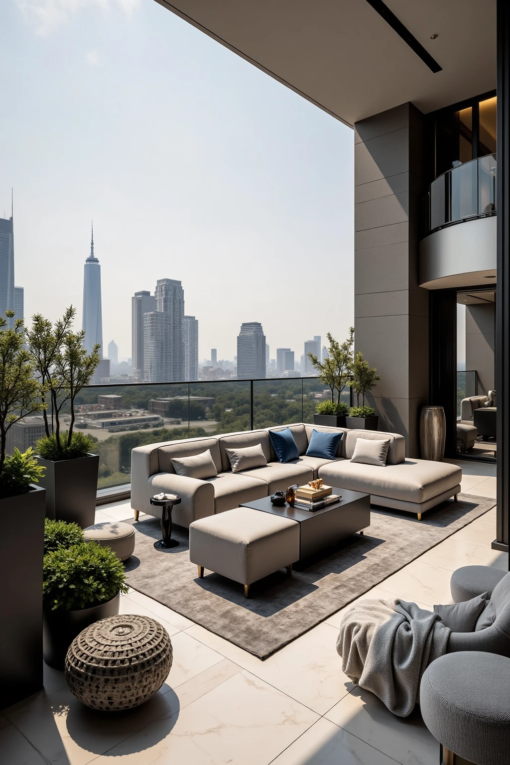 9. High - end interior design style, a balcony with luxury outdoor furniture, potted plants, and a view of the city skyline.