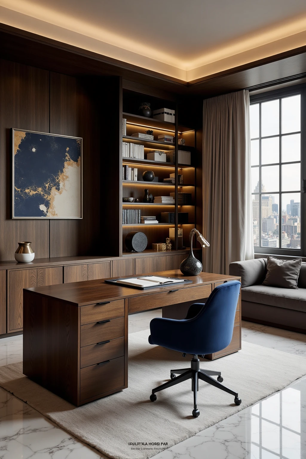 4. High - end interior design style, a study room with built - in bookshelves, a leather - topped desk, and a comfortable armchair by a large window.