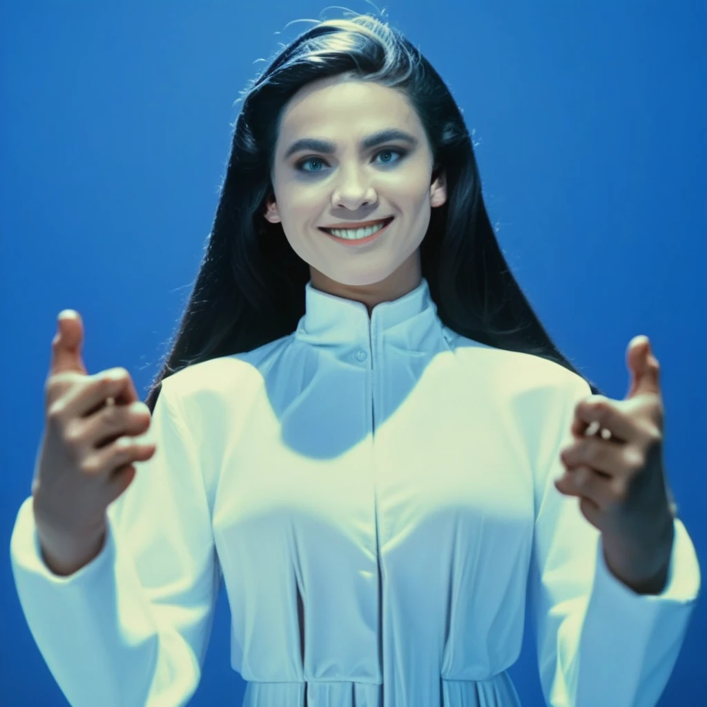female spacevampire male_victims 1girl solo long hair blue theme dress looking at viewer black hair white dress smile long sleeves upper body colored skin hands up 1girl tall perfect woman ??????? ???? solo breasts photo score_9 score_8_up score_7_up raw_source action scene movie stil of (supermodel).