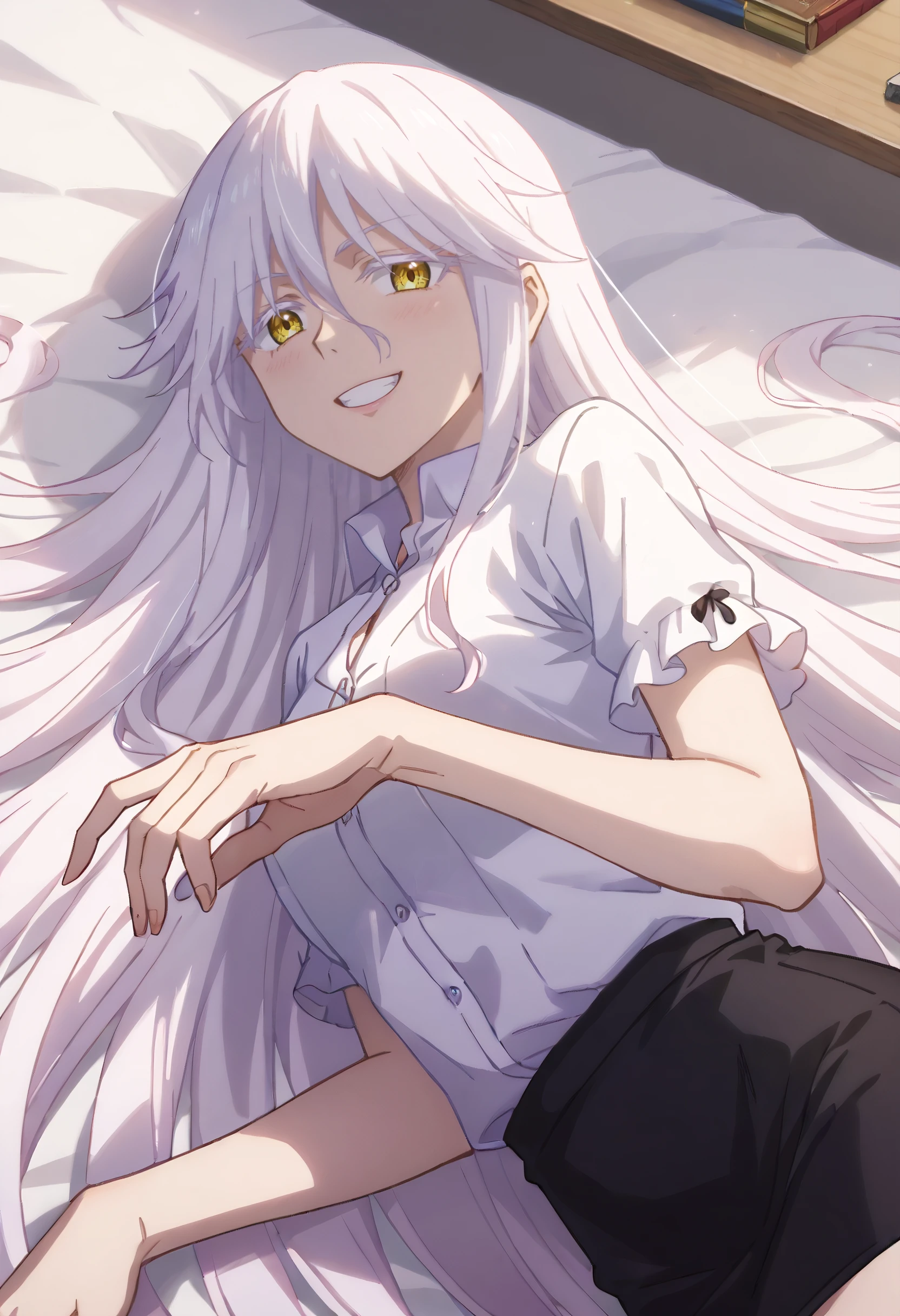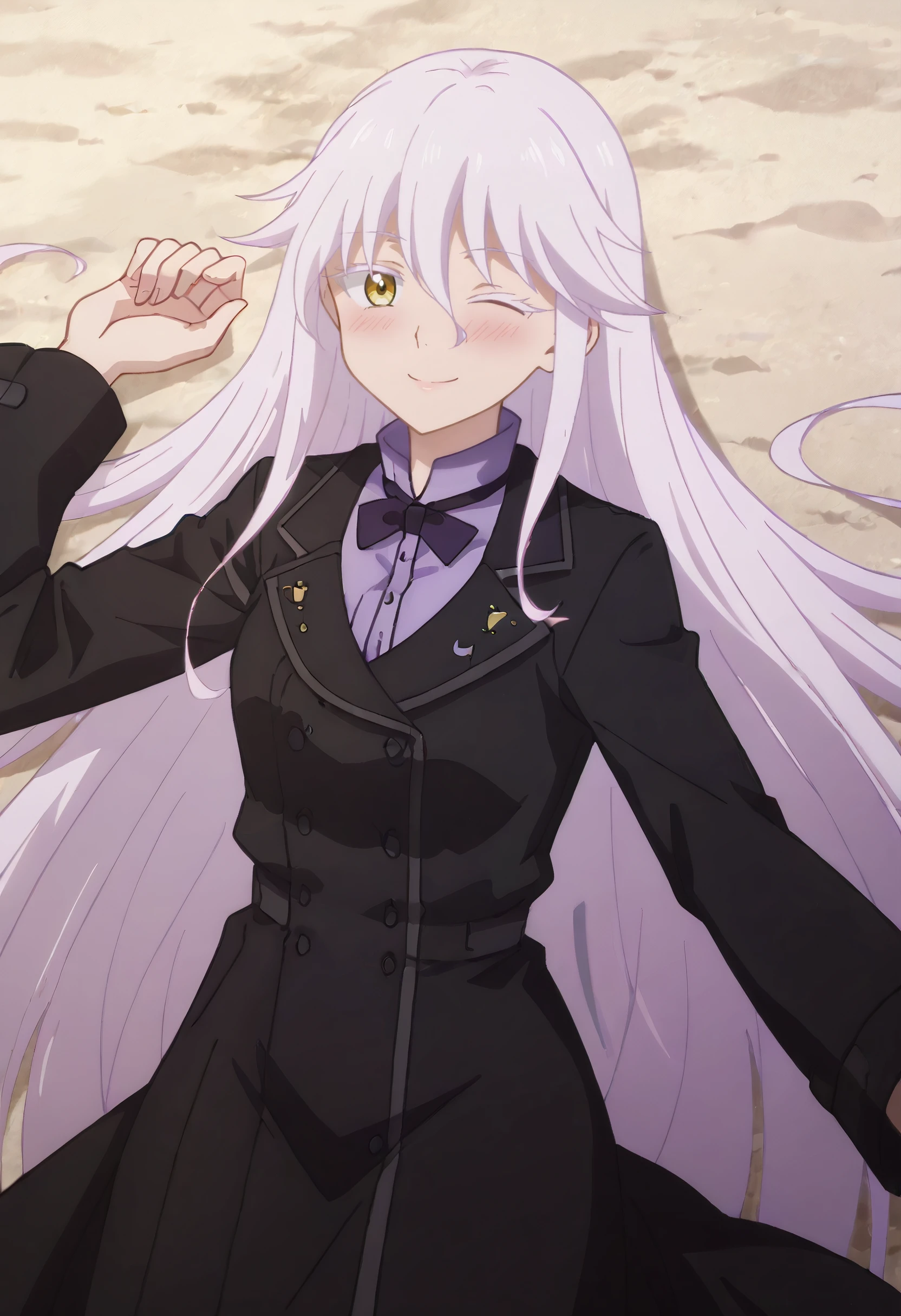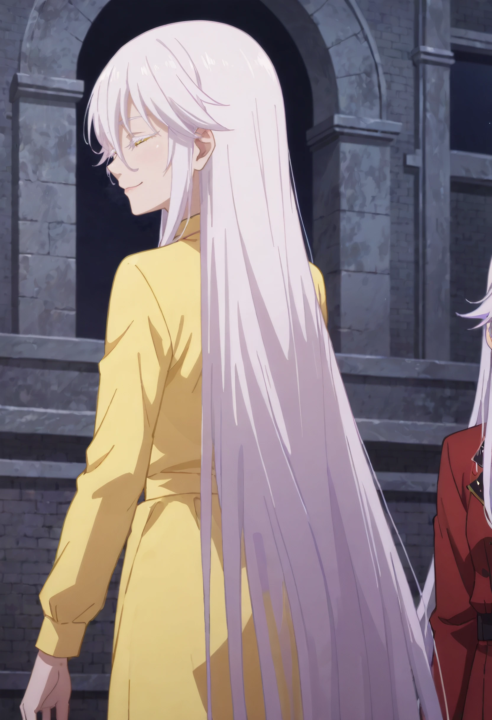 HNMLiselotte, white hair, long hair, very long hair, hair between eyes, yellow eyes, hair flaps, colored eyelashes,