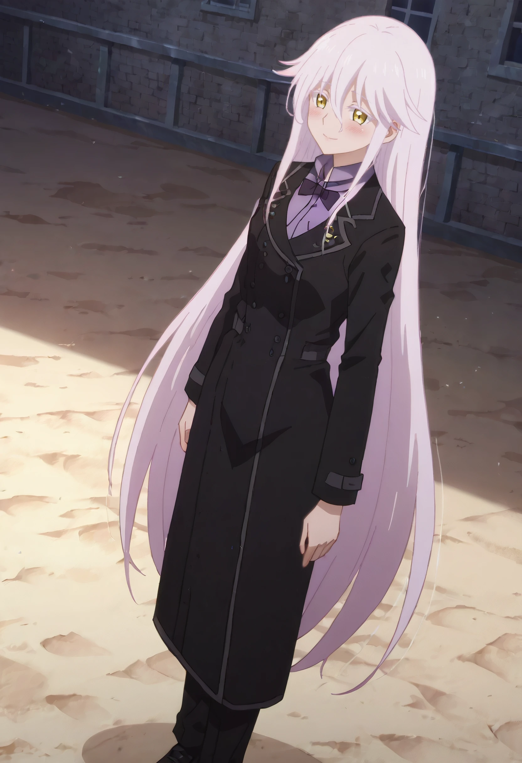 LiselotteOutfit, long sleeves, black jacket, jacket, coat, black coat, collared shirt, formal clothes, buttons, bow, sidelocks, trench coat, bowtie, black bow, straight hair, double-breasted, black bowtie, neck ribbon, black pants, military uniform, military, black footwear, pants,