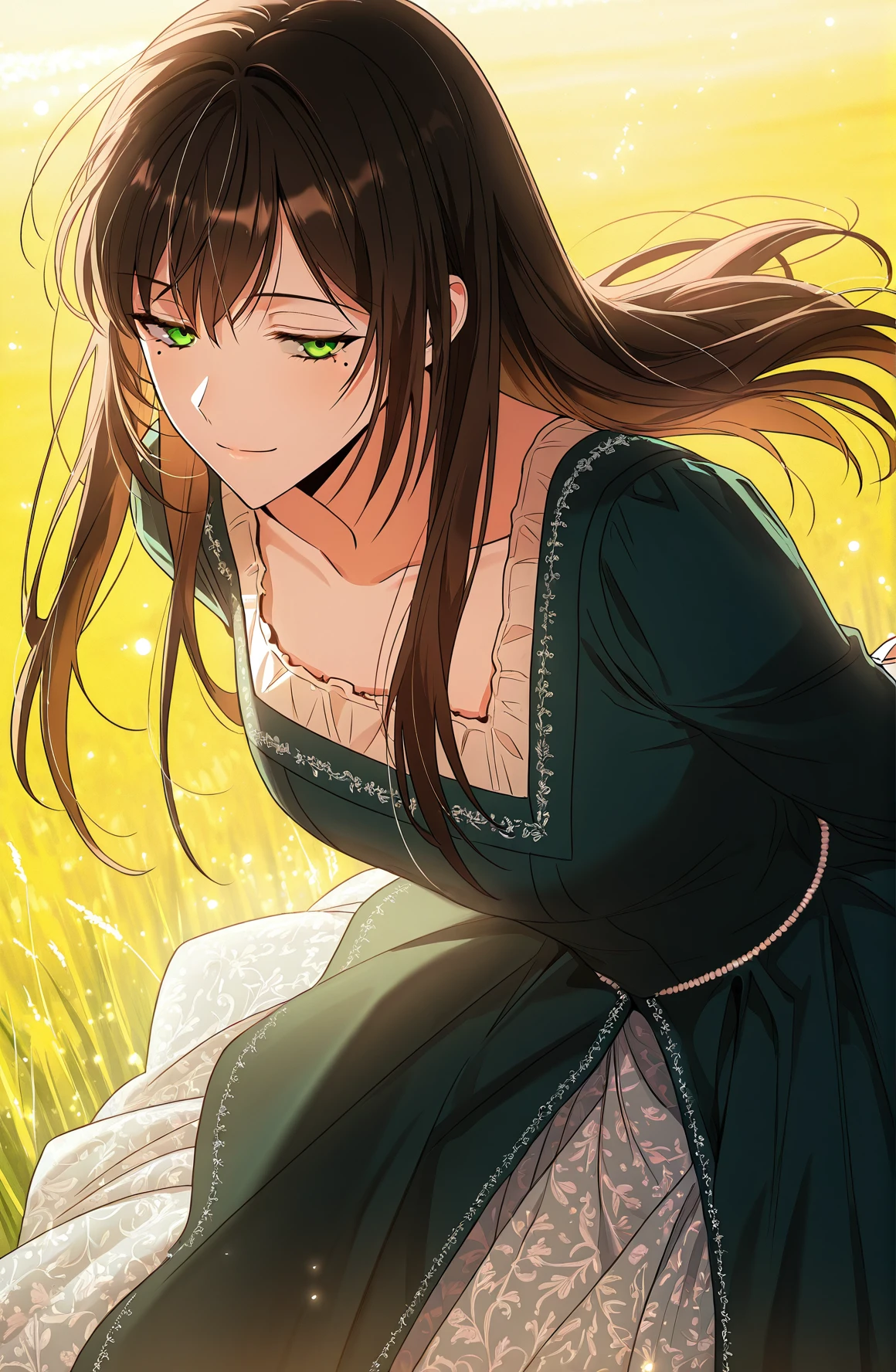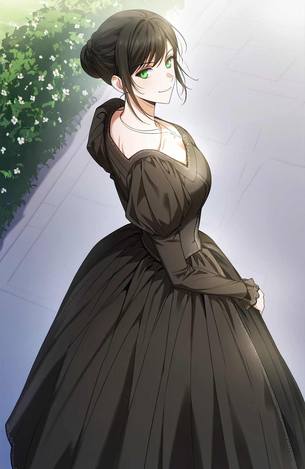 Ariadne, 1girl, solo, neon green eyes, dark brown hair, side swept bangs, hair between eyes, straight hair, long sidelocks, tied hair, bun, beauty mark under eye,
