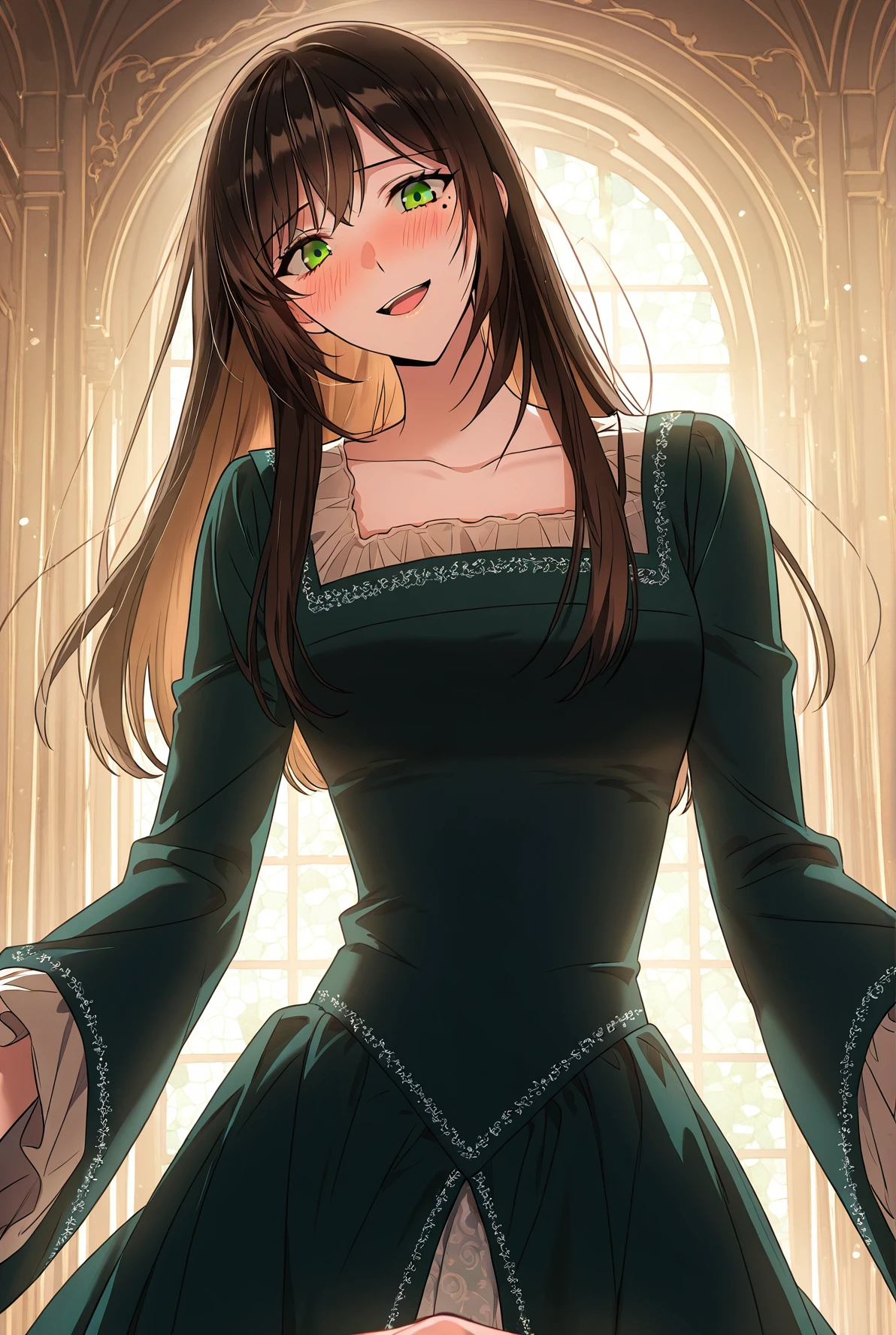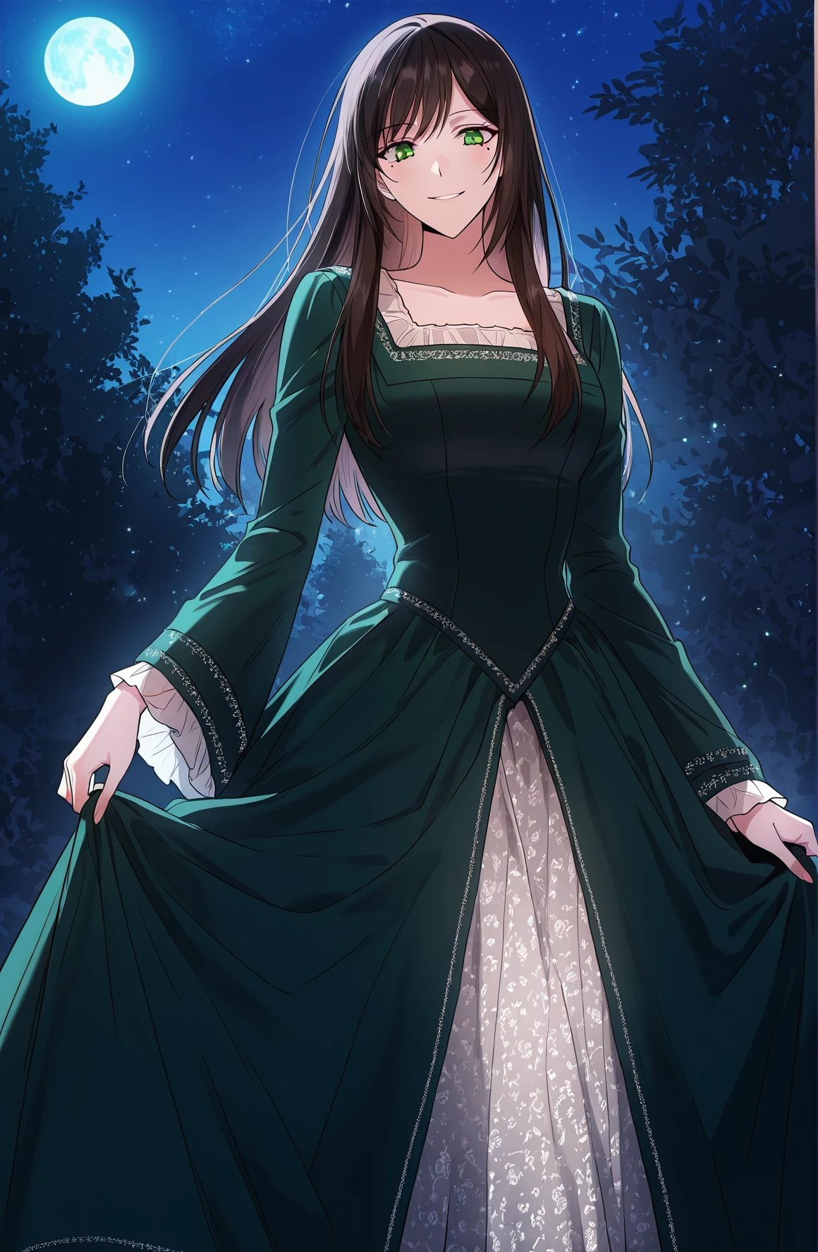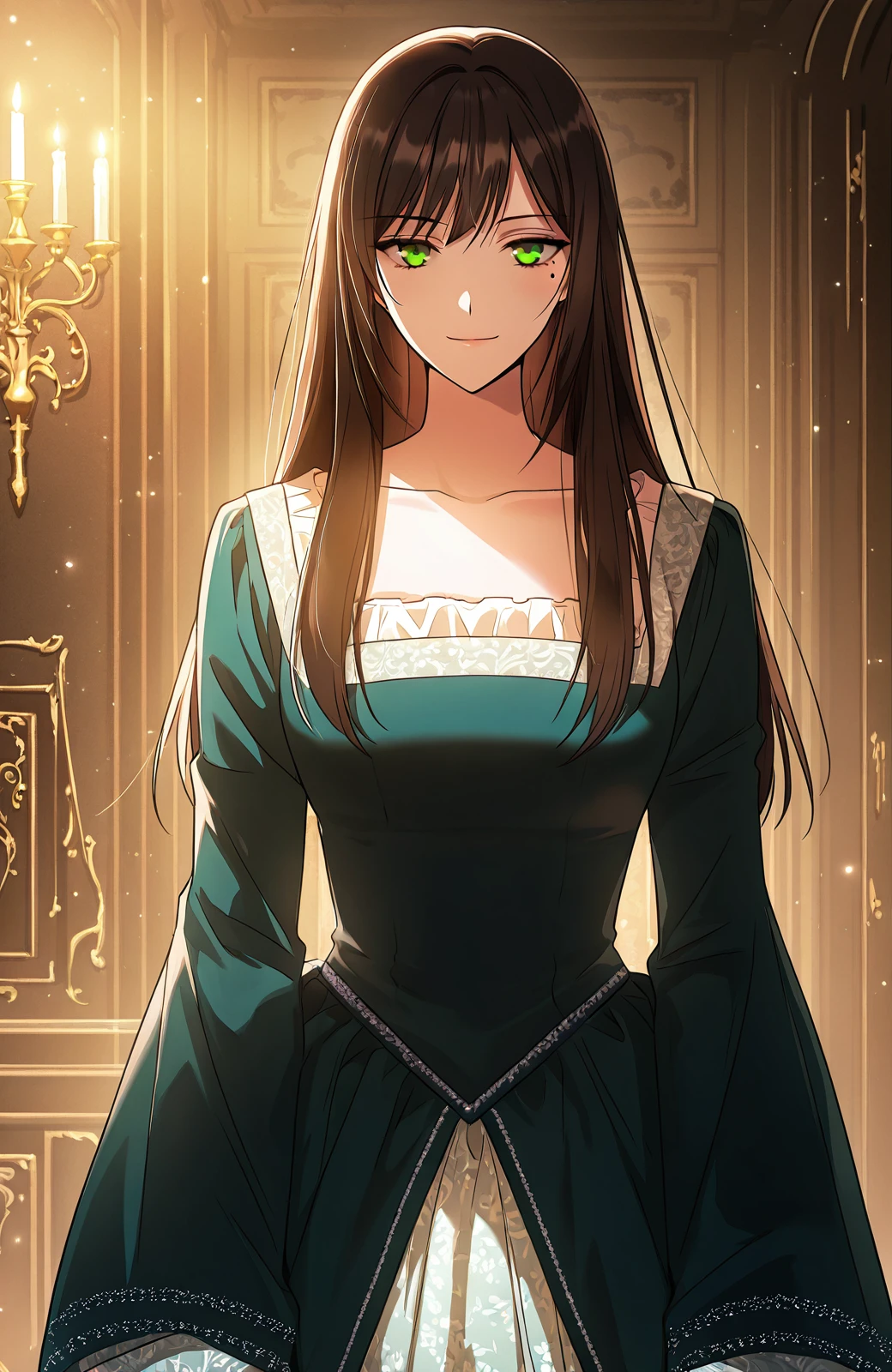Ariadne, 1girl, solo, neon green eyes, dark brown hair, long hair, see through bangs, wispy bangs, hair between eyes, straight hair, long sidelocks, beauty mark under eye,
