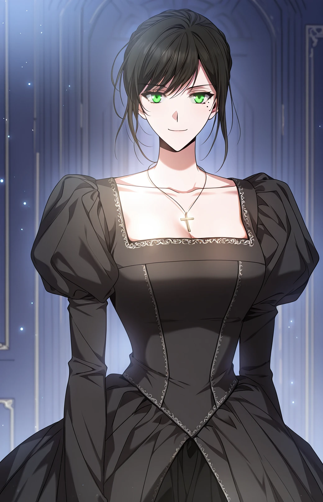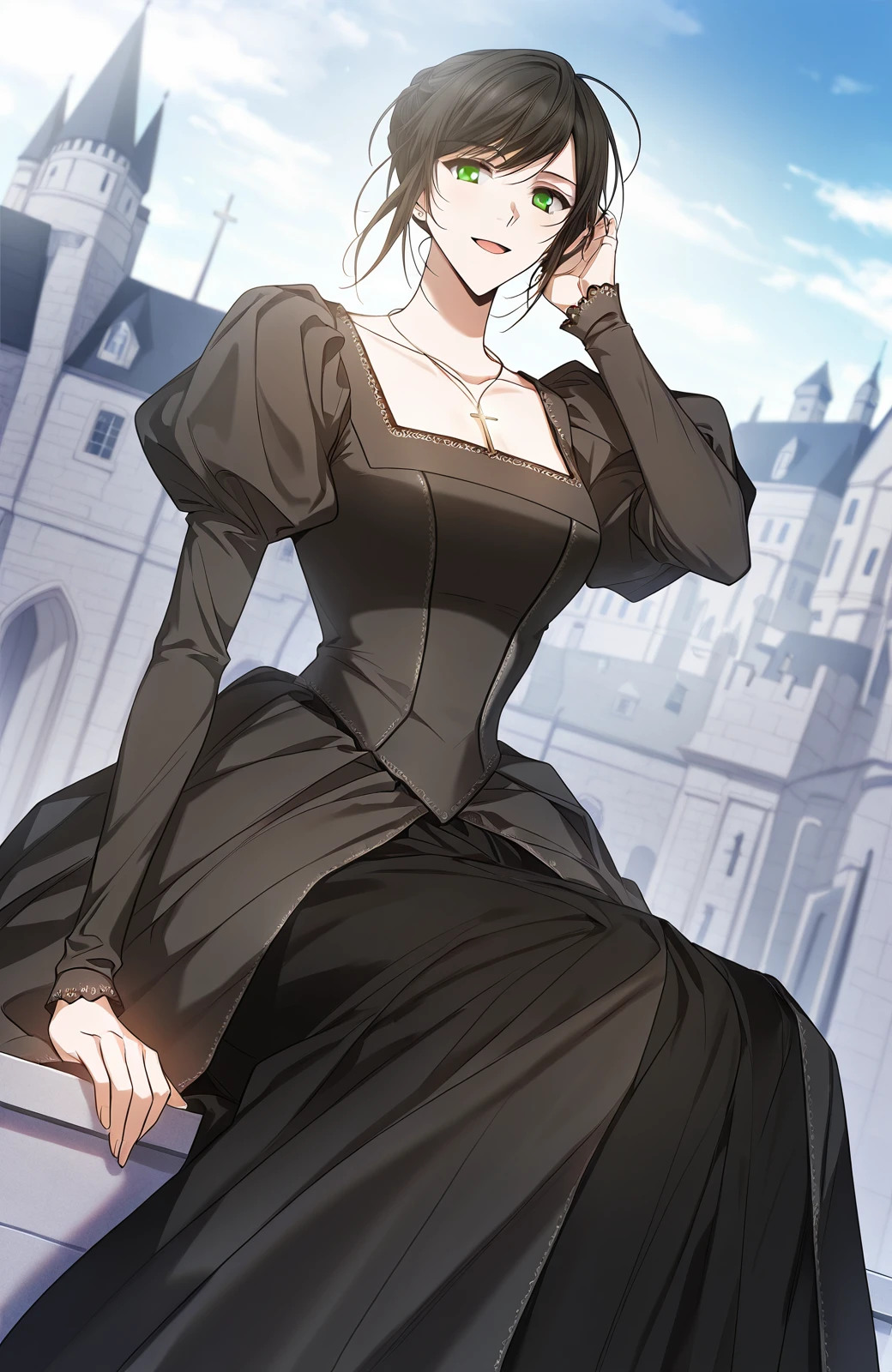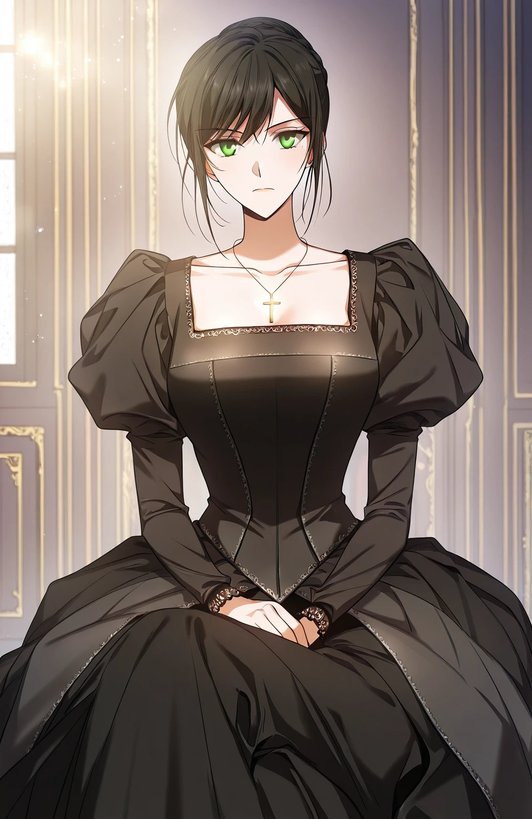 Ariadne_outb, black dress, puff sleeves, square neckline, embroidered trim, fitted bodice, lace cuffs, black outer skirt, long skirt, front slit, dark black inner skirt, long skirt, cross necklace,