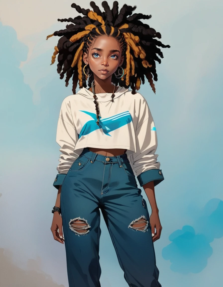 In this realm where the tangible is transient, and the virtual, vividly vibrant, Zara's artistry is her rebellion, her creation an act of defiance against the binary bounds. She adorns herself with relics of a bygone era, re-engineered through the lens of tomorrow—cerulean denim melded with kinetic weaves, jackets that tell tales in tactile code.