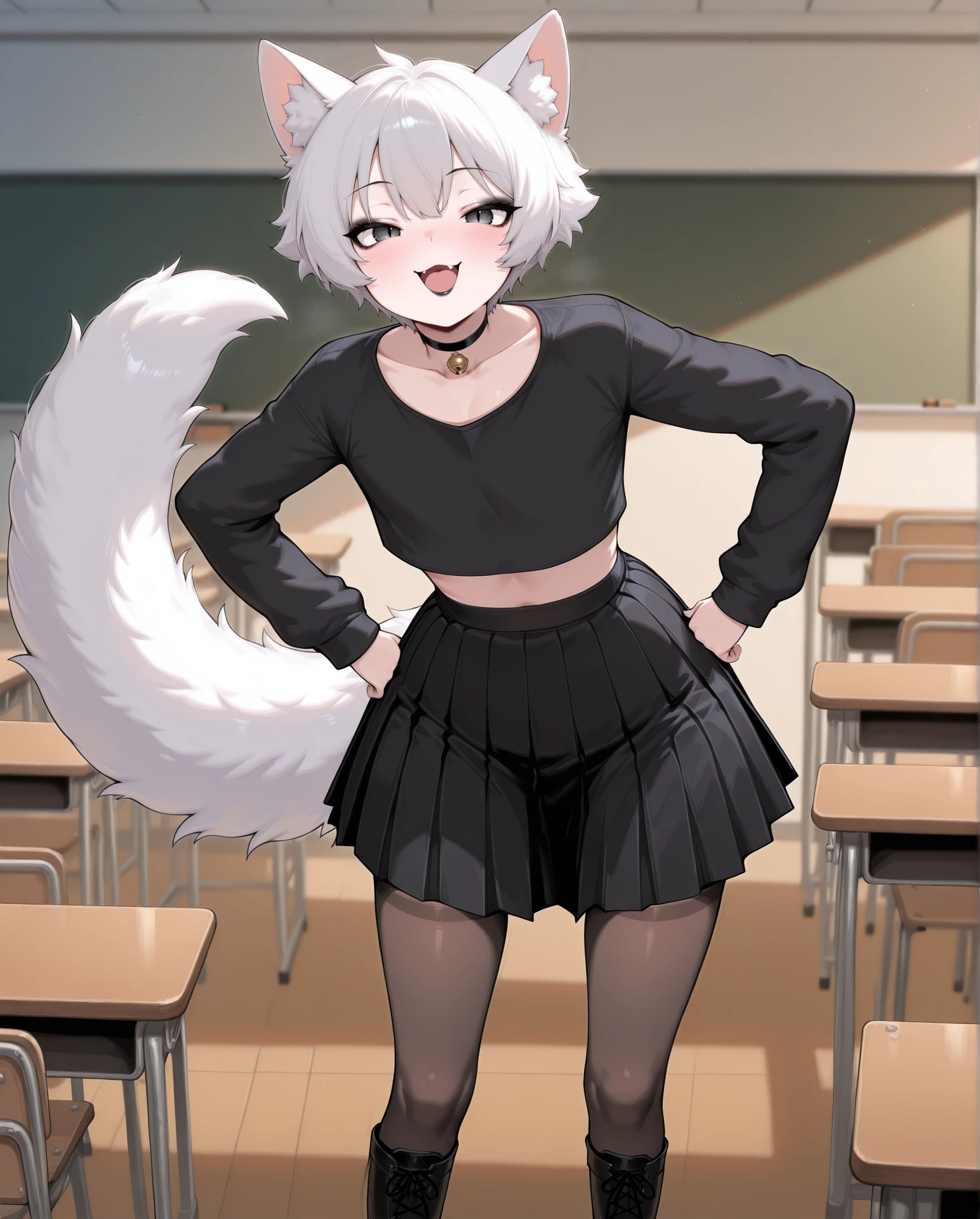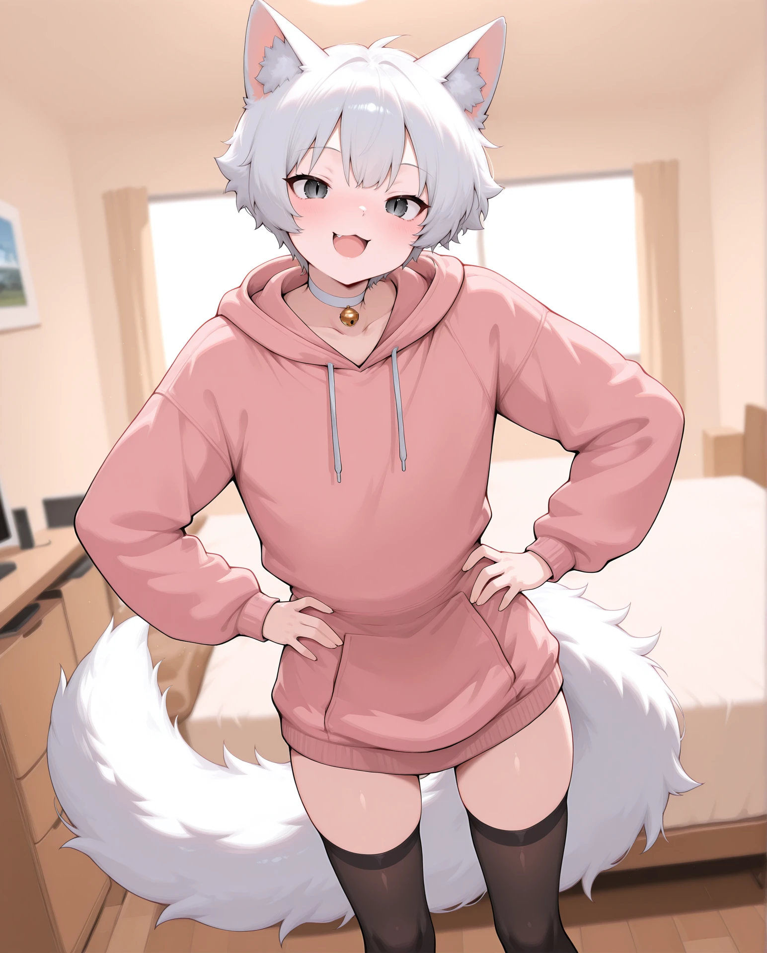 Trigger: 1boy, solo, male focus, otoko no ko, white hair, short hair, hair between eyes, grey eyes, slit pupils, cat ears, animal ears, animal ear fluff, cat tail, fluffy tail, cat boy, :3,