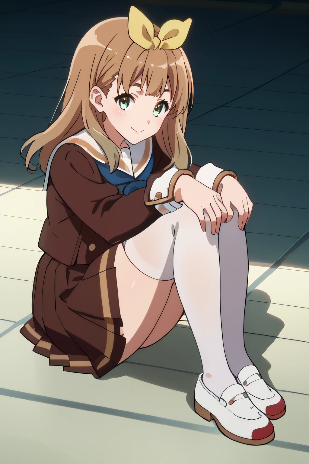 school uniform, white sailor collar, blue neckerchief, long sleeves, white cuffs, brown shirt, pleated skirt, dark brown skirt, thighs, white thighhighs, white shoes