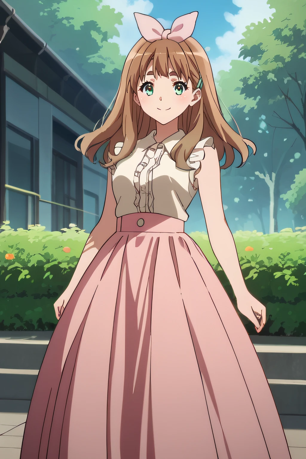white frilled shirt, sleeveless, pink skirt, long skirt