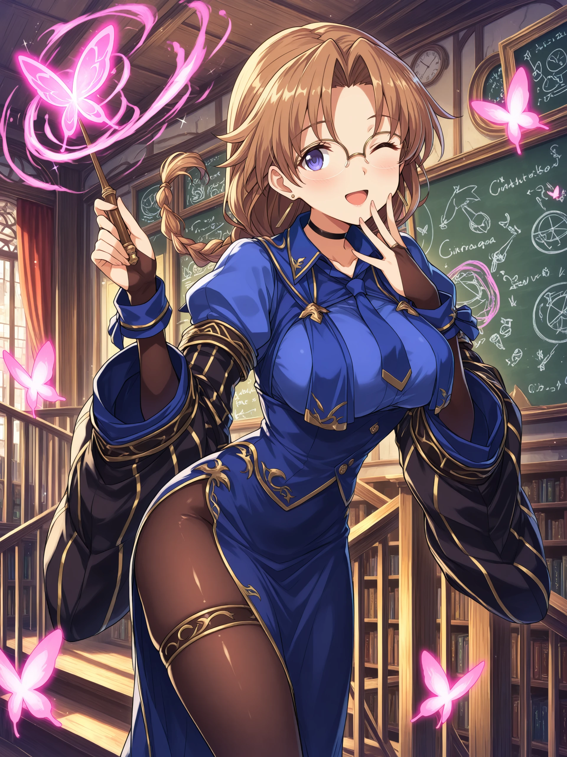 blue dress, gold trim, choker, necktie, puffy sleeves, wide sleeves, bridal gauntlets, wrist cuffs, side slit, thighband pantyhose, strappy heels