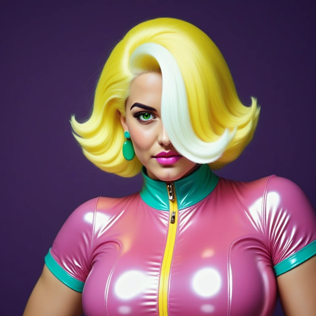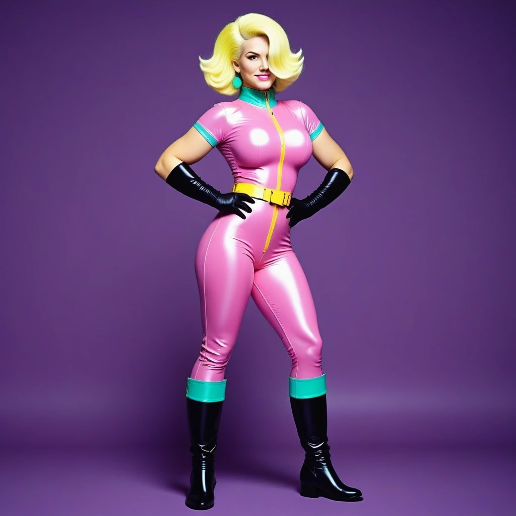 docblight, doctorblight, doctblight, vibrant blonde hair, blonde hair with a small white streak, short voluminous hairstyle, hair over one eye, pink lips, green eyes, vibrant green pupils, black eyebrows, turquoise earrings, skin-tight pink jumpsuit, shiny pink latex suit, short sleeves, turquoise collar, long vibrant yellow zipper, yellow zipper goes down to crotch, yellow belt, turquoise seams, turquoise seams on boots, black gloves, long black gloves, shiny black gloves, black boots, high black boots, flat sole boots, curvy body, voluptuous figure, big breasts, wide hips, big butt, symmetrical outfit, retro-futuristic style, vibrant colors, confident pose