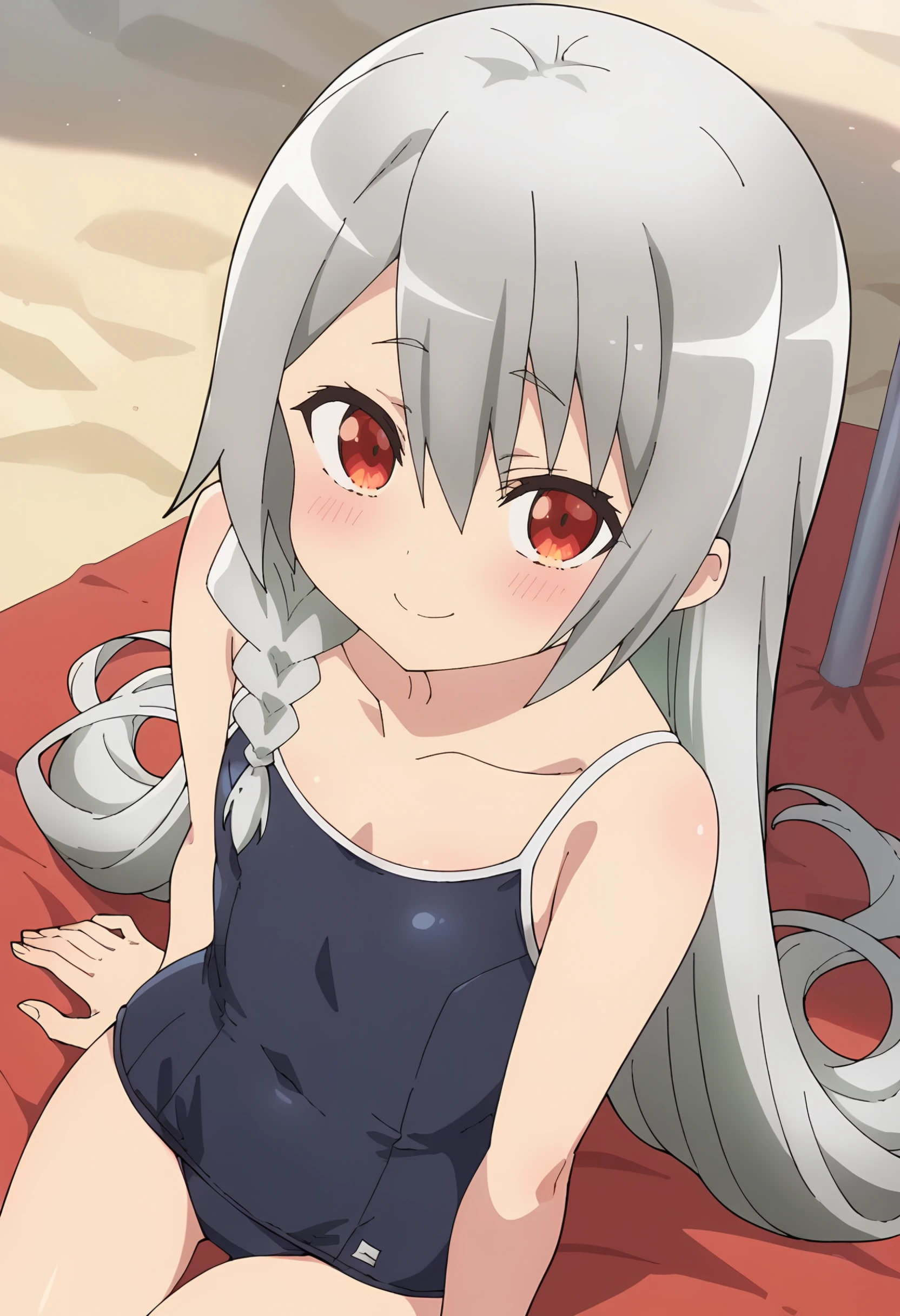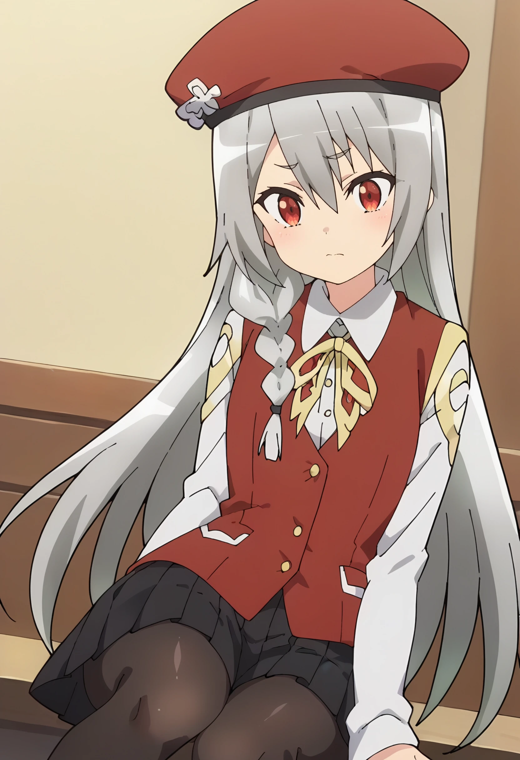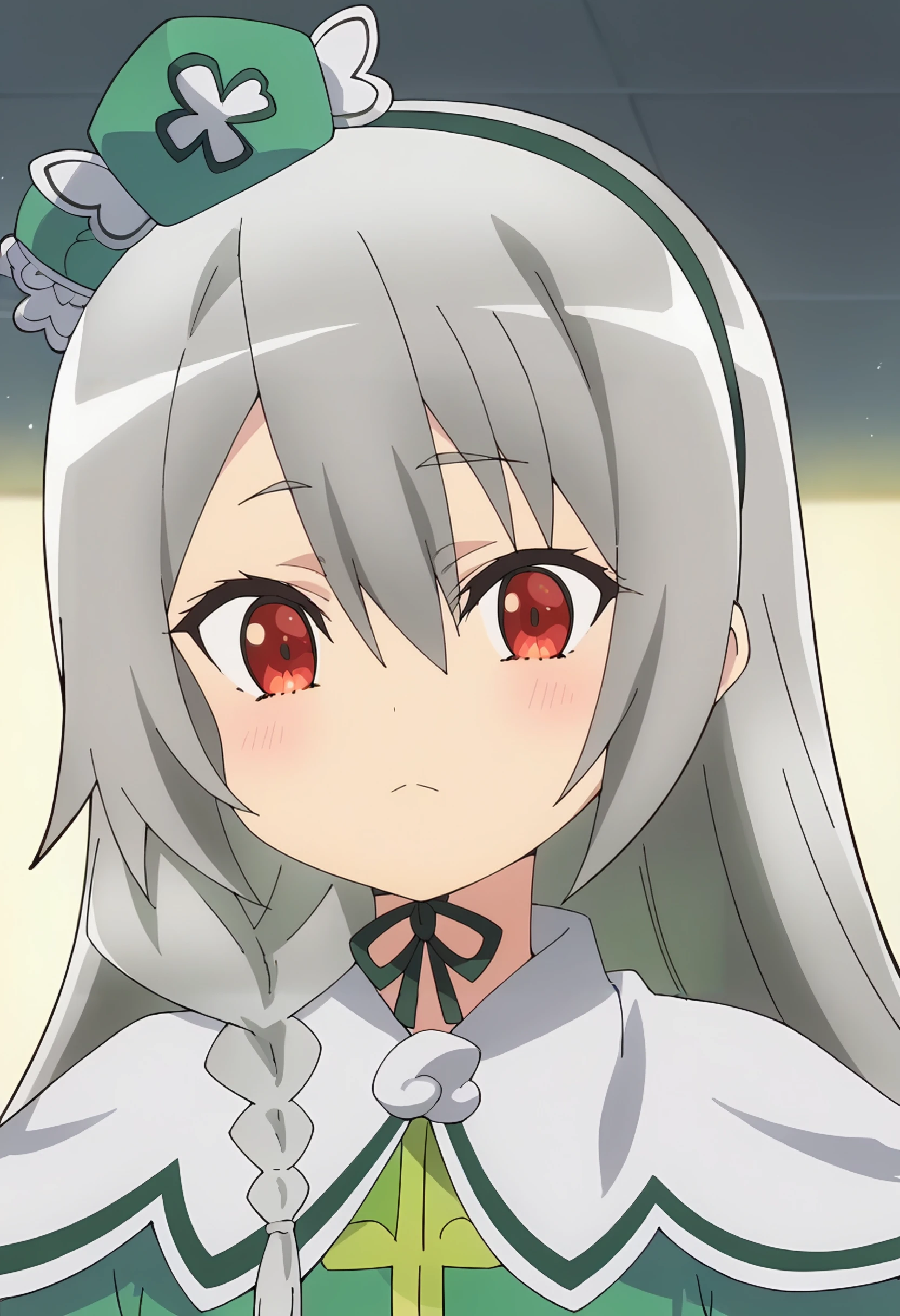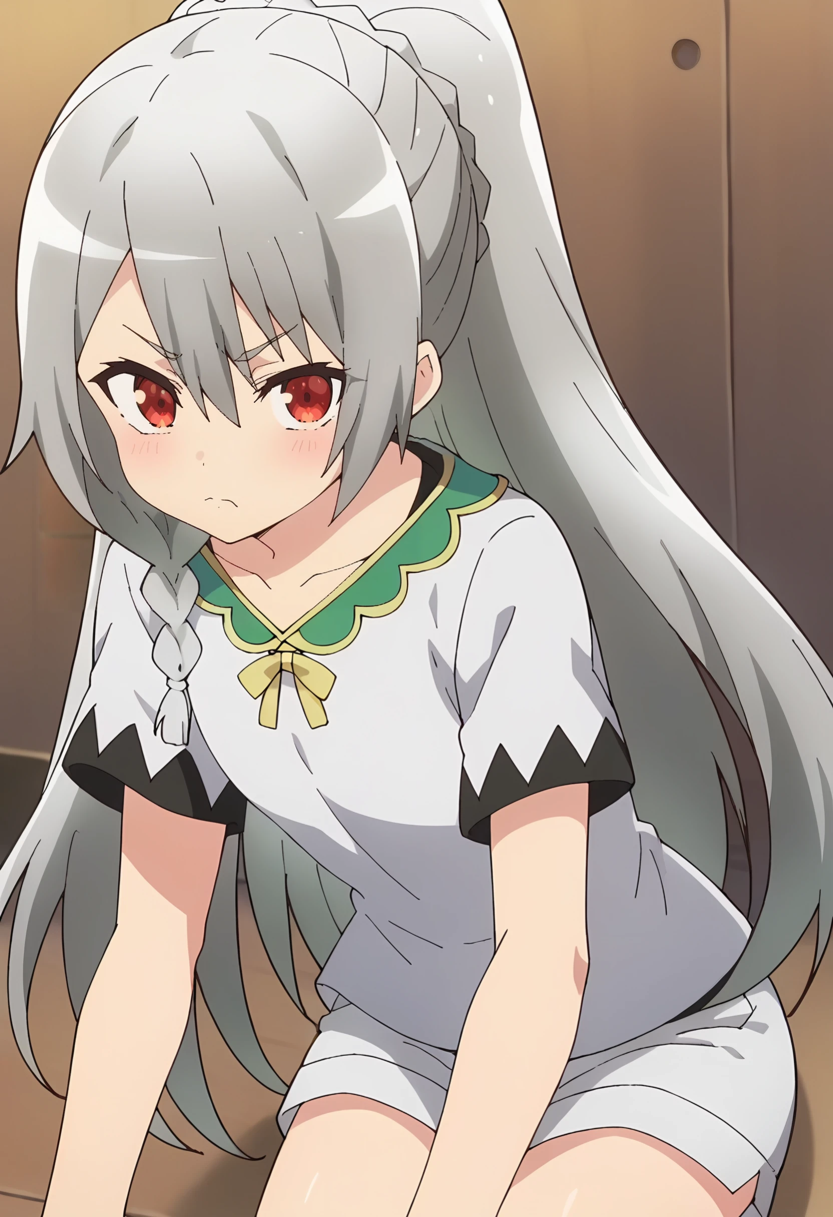 maidena, grey hair, long hair, 1girl, red eyes, solo, hair between eyes, braid,