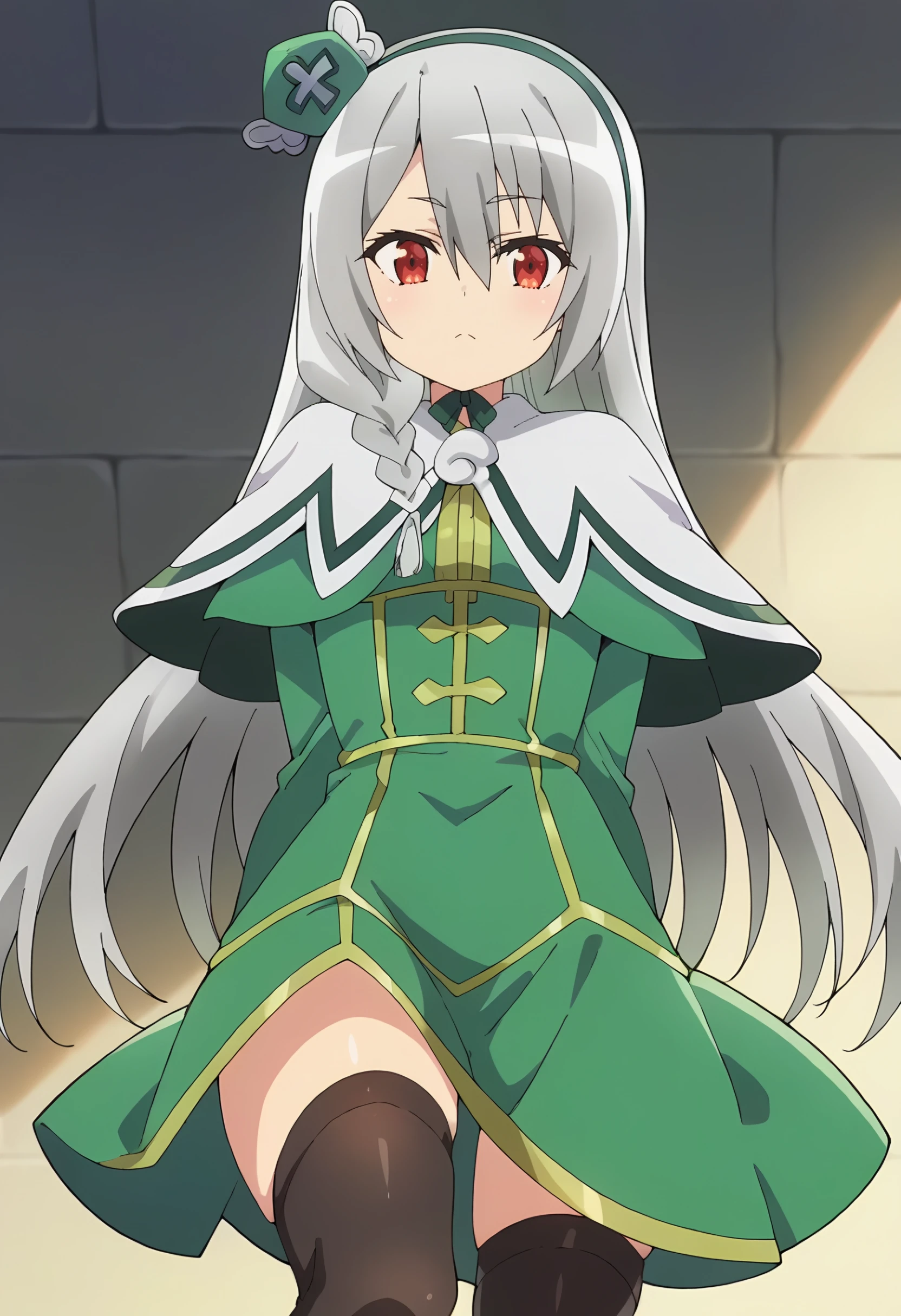 outfit: green dress, thighhighs, capelet, green hairband, long sleeves, hair ornament,mini hat,