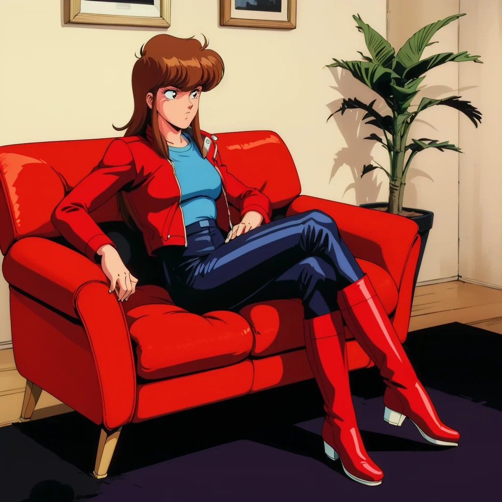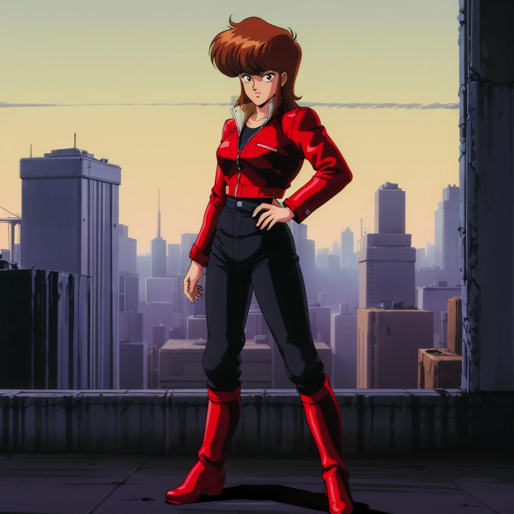 red jacket,black pants,red boots,