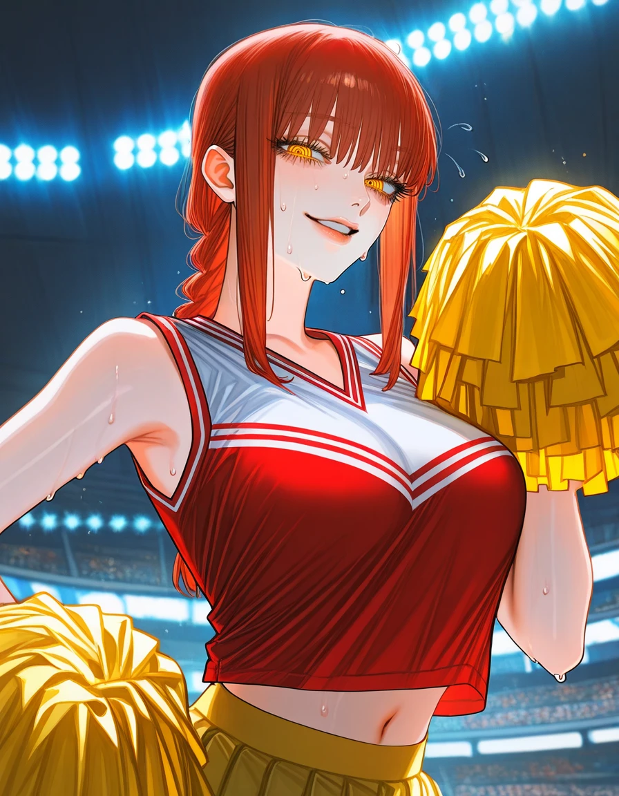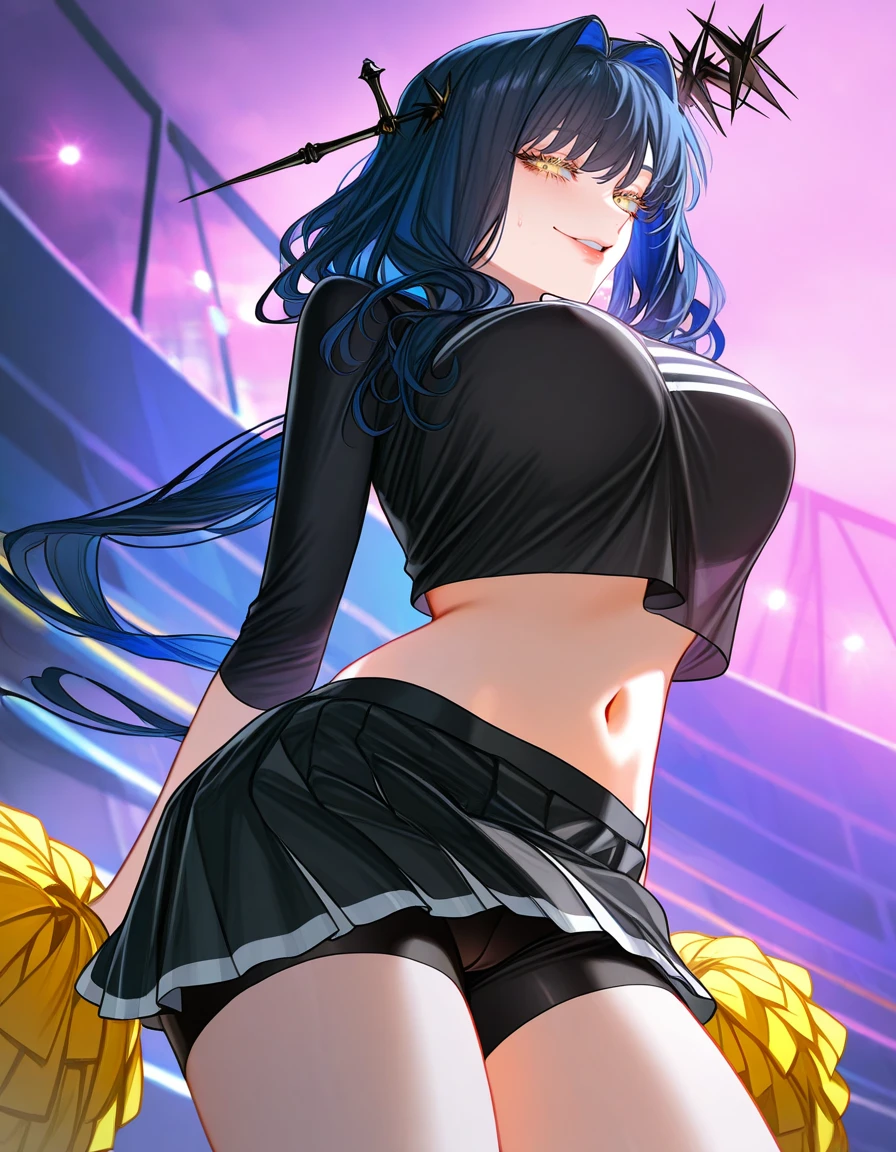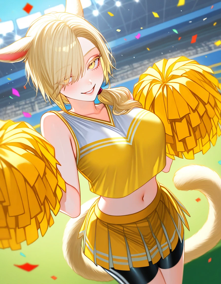 1girl, blonde hair, long hair, umacheer, yellow shirt, yellow skirt, seductive smile, pom pom \(cheerleading\), cheerleader, midriff, navel, yellow eyes, looking at viewer