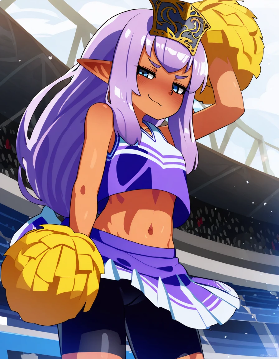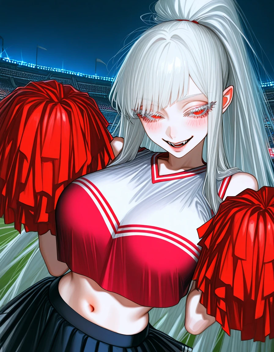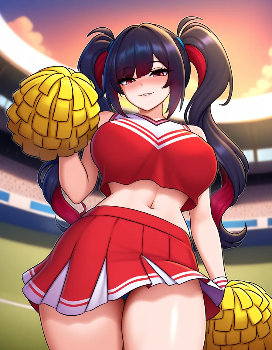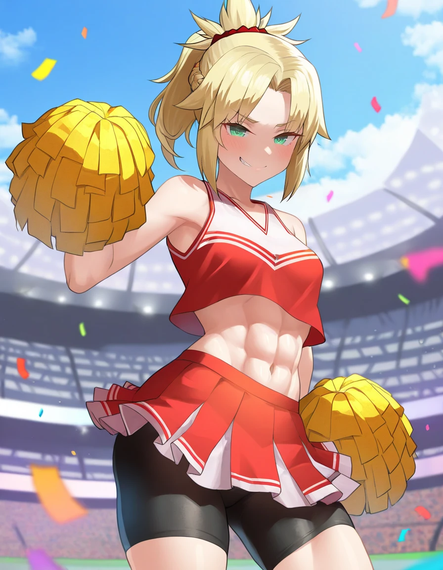 1girl, blonde hair, long hair, umacheer, yellow shirt, yellow skirt, seductive smile, pom pom \(cheerleading\), cheerleader, midriff, navel, yellow eyes, looking at viewer