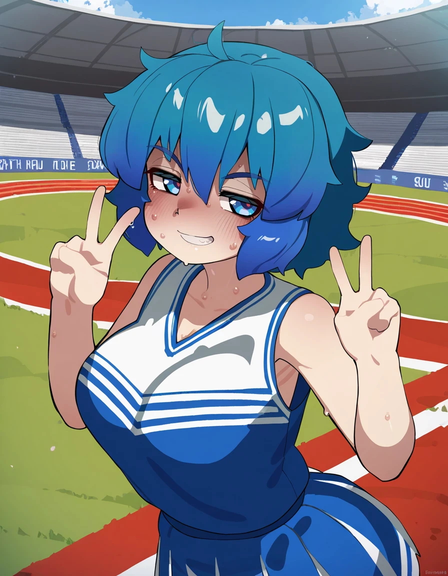 Optional - pom pom (cheerleading), bike shorts under skirt, midriff, navel, shirt tucked in,